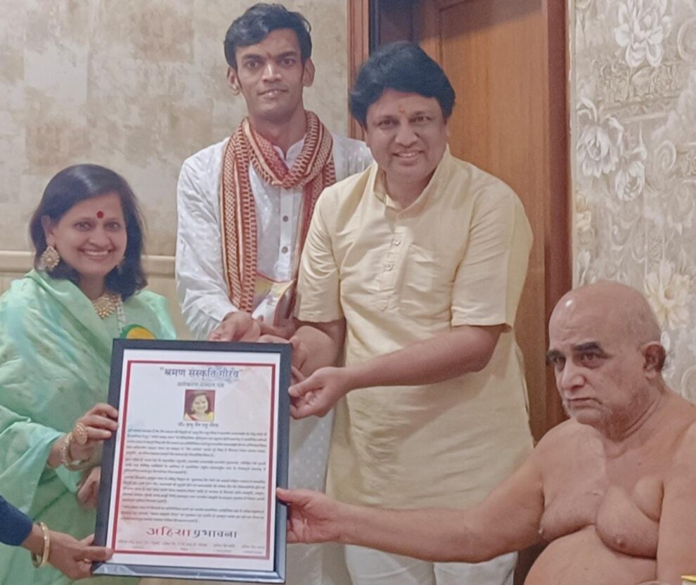 नई दिल्ली। उपाध्याय श्री गुप्तिसागर जी मुनिराज के सानिध्य में निर्माण विहार जिनालय के सभागार में आयोजित परिषद के वार्षिक उत्सव समारोह में अहिंसा प्रभावना की ओर से प्रधानमंत्री नरेन्द्र मोदी के सानिध्य में हुए नवीन संसद भवन के भूमि पूजन एवं ऐतिहासिक उद्घाटन समारोह में आयोजित “सर्वधर्म प्रार्थना सभा” में जैनधर्म का प्रतिनिधित्व करने एवं अनेक राष्ट्रीय – अंतरराष्ट्रीय स्तर के आयोजनों में जैनधर्म संस्कृति का प्रचार-प्रसार करने के लिए डॉ. इन्दु जैन राष्ट्र गौरव को “श्रमण संस्कृति गौरव” पुरस्कार एवं सम्मान से सम्मानित किया गया।