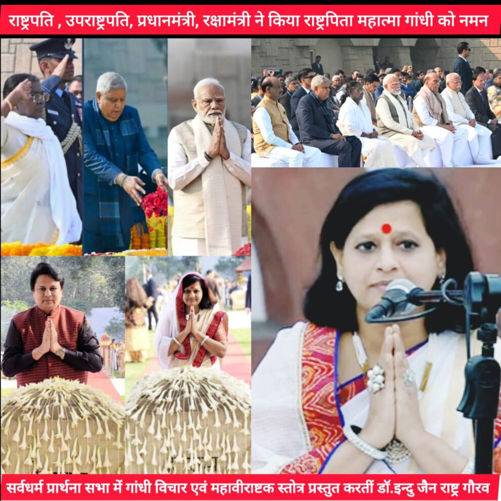 अभिवादन करते हुए डॉ. इन्दु जैन ने माननीय प्रधानमंत्री जी से भगवान महावीर केन्द्र ,अहिंसा स्थल,दिल्ली में 9-10 अप्रैल 2025 से होने जा रहे महामस्तकाभिषेक में आने का निवेदन भी किया । श्रद्धांजलि सभा में सर्वधर्म प्रार्थना सभा के अंतर्गत जैन, बौद्ध, ईसाई, पारसी, बहाई, यहूदी, मुस्लिम, सिक्ख, हिन्दु सभी धर्म के प्रतिनिधियों ने बापू को नमन करते हुए विश्व शांति की भावना से प्रार्थनाएं कीं।