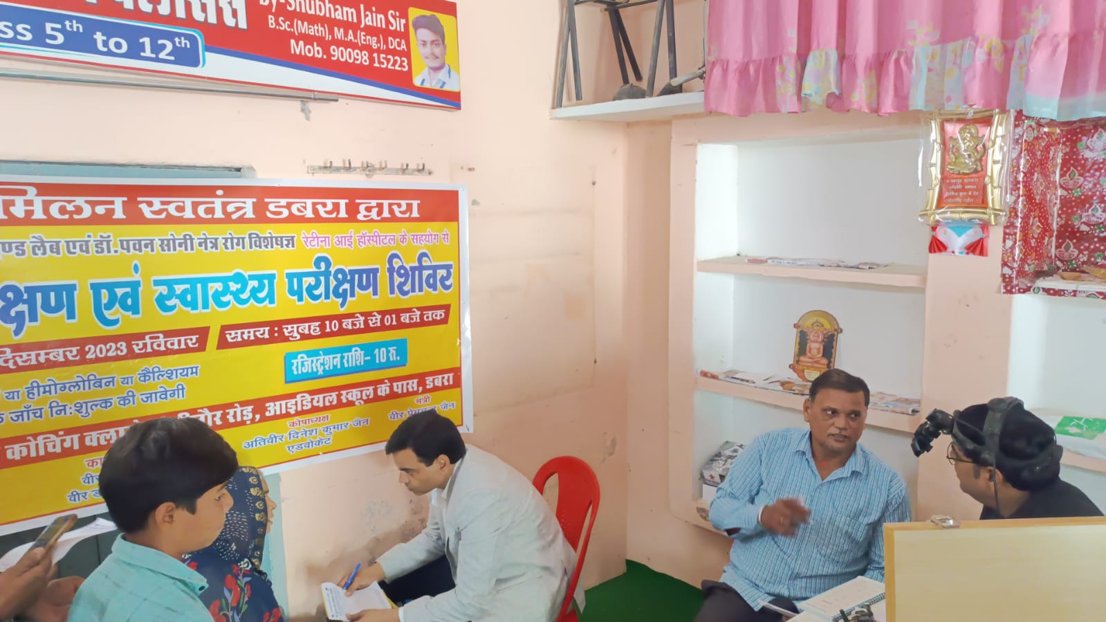 चीनोर रोड। जैन मिलन स्वतन्त्र डबरा ने 17 दिसंबर को प्रथम कोचिंग क्लासेस चीनोर रोड पर नेत्र परीक्षण और स्वास्थ्य शिविर का आयोजन किया। इस अवसर पर शिविर का शुभारम्भ भगवान महावीर के 2550 वें निर्वाण महोत्सव पर दीप प्रज्वलन एवं महावीर प्रार्थना करके किया गया । नेत्र रोग विशेषज्ञ डॉ पवन सोनी रेटीना आई हॉस्पिटल के सहयोग से नेत्र परीक्षण किया गया । जिसमें लगभग 100 मरीजों की जांच की गई और उचित परामर्श दिया गया । पैथ काइंड लैब की सहयोग से रक्त परीक्षण शिविर में लगभग 70 मरीजों की जांचे हुई जिसमें शुगर, कोलेस्ट्रॉल, कैल्शियम हीमोग्लोबिन में से कोई एक जांच की गई ।