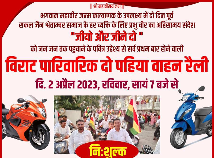 इंदौर। महावीर बाग से 2 अप्रेल 2023 रविवार, सायं 7 बजे पारिवारिक दुपहिया वाहन रैली निकाली जाएगी। श्वेतांबर जैन महासंघ, इंदौर के तत्वावधान मे प्रभु महावीर का अहिंसामय संदेश “जियो और जीने दो” जन जन तक पहुँचे इसके लिए इंदौर मे पहली बार होने वाली प्रभु वीर जन्म कल्याणक के 2 दिन पूर्व समग्र जैन श्वेतांबर समाज की एक विराट पारिवारिक दो पहिया “वाहन रैली” निकाली जा रही है।
