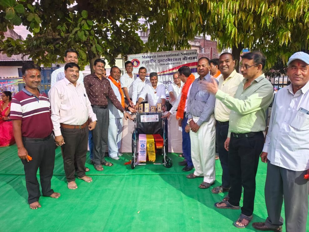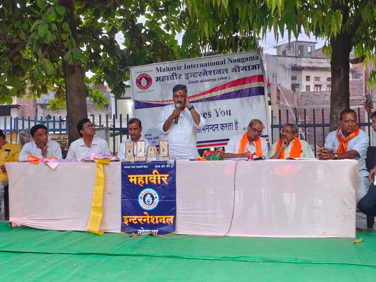 इस अवसर पर महावीर इंटरनेशनल शाखा के अध्यक्ष सुरेश चंद्र गांधी ने शब्द सुमन से सभी का स्वागत अभिनंदन किया एवं शाखा की गतिविधियों पर प्रकाश डाला। गांधी ने बताया कि महावीर इंटरनेशनल शाखा गत 20 वर्षों से पीड़ित मानव मात्र की सेवा कर रही है। मुख्य रूप से रक्तदान शिविर नेत्र जांच शिविर वृक्षारोपण बेबी किट वितरण प्यासे पक्षियों के लिए परिंडे वितरण मेडिकल कैंपों का आयोजन कर मानव मात्र की सेवा में यहां के वीर कार्यकर्ता अपनी सेवाएं दे रहे हैं। इस अवसर पर अनिल जैन में अपने उद्बोधन में कहा कि महावीर इंटरनेशनल एक बहुत बड़ा राज परिवार है, जो पूरे संपूर्ण भारत एवं विश्व में सेवा कार्य के रूप में अग्रणी कार्य कर रहा है। मानव मात्र की सेवा करना हमारा धर्म है और यहां वागड़ क्षेत्र में महावीर इंटरनेशनल नौगामा शाखा के सेवा कार्यों को देखकर बड़ी प्रसन्नता हुई। यहां के सभी वीर कार्यकर्ता कंधे से कंधा मिलाकर मानव मात्र की सेवा में अपनी अग्रणी सेवा दे रहे हैं, साथ ही नौगामा शाखा के अध्यक्ष सुरेश चंद्र गांधी स्काउट के माध्यम से अनुशासन सेवा भाव एवं सभी समाज जनों को लेकर जो सेवा कार्य कर रहे हैं। उनके उज्जवल भविष्य की कामना करता हूं, साथ ही विश्वास करता हूं कि इस वागड़ क्षेत्र में अधिक से अधिक सेवा कार्य करके महावीर महावीर इंटरनेशनल को ऊंचाइयों पर ले जाएंगेष सभी वीर बंधुओं से निवेदन किया कि रात्रि में ई चौपाल के माध्यम से संपूर्ण भारतवर्ष के कार्यकर्ताओं का सेवा कार्य की प्रति जो भाव है, वह देखने मिलता है और संपूर्ण भारत में जो सेवा कार्य किया जा रहे हैं कार्यों का आदान-प्रदान होता है।आप भी ई चौपाल से जुड़ें। कार्यक्रम अपेक्स कार्यालय से प्राप्त व्हीलचेयर सुखोदय तीर्थ नसिया जी के लिए दिगंबर जैन समाज को प्रदान की किस अवसर पर दिगंबर जैन समाज नौगामा की ओर से भी पगड़ी पहना कर दुपट्टा उड़ा कर सम्मान किया गया। प्रतिवर्ष की भांति इस वर्ष भी मंदिर परिसर में नौगामा शाखा द्वारा यात्रियों के लिए शीतल प्याऊ लगाई गई है। समस्त अतिथियों द्वारा इसका लोकार्पण किया गया।