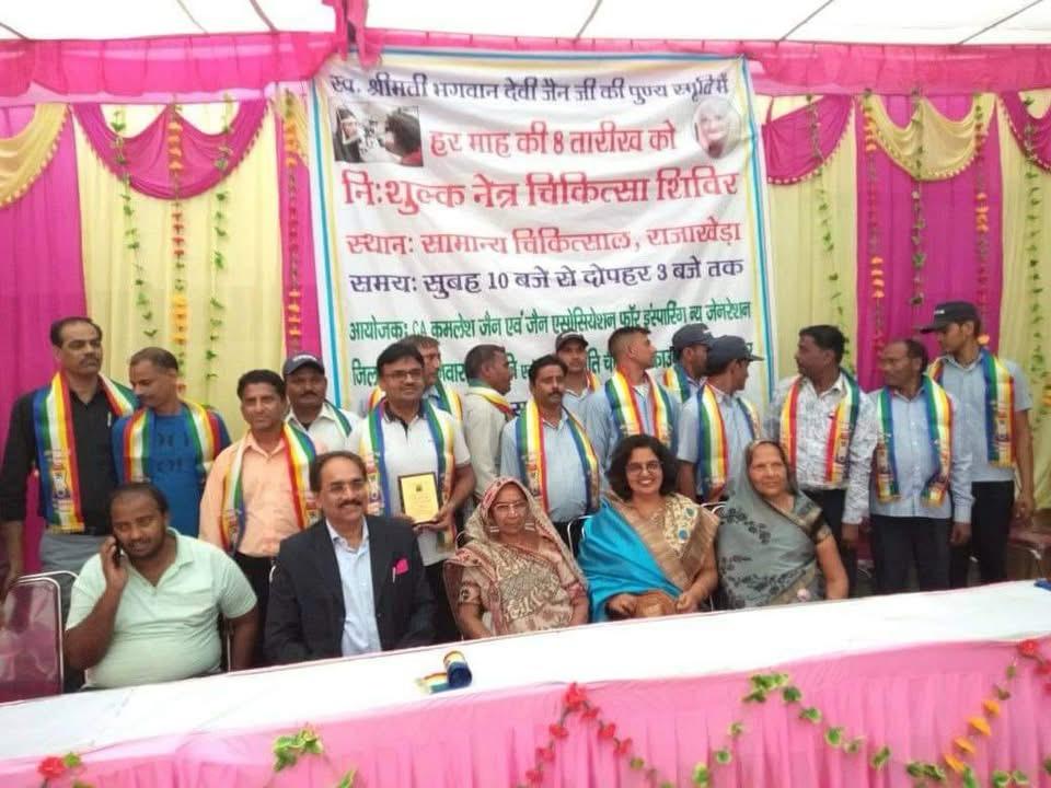 मुरैना/राजाखेड़ा। पीड़ित मानव सेवार्थ जैसवाल जैन सेवा न्यास परिवार द्वारा राजाखेड़ा में निःशुल्क नेत्र परीक्षण शिविर 08 सितंबर को लगाया जाएगा। अखिल भारतीय दिगंबर जैसवाल जैन सेवा न्यास के महामंत्री सीए कमलेश जैन गुरुग्राम ने बताया कि स्व. भगवानदेवी जैन की पुण्य स्मृति में डॉ. भसीन द्वारा संचालित रतन ज्योति चौरिटेबिल ट्रस्ट ग्वालियर के तत्वावधान में जैसवाल जैन सेवा न्यास के सहयोग से राजाखेड़ा में निःशुल्क चिकित्सा शिविर प्रातः 10 से दोपहर 1 बजे तक लगाया जा रहा है। इस शिविर में सम्मिलित होने वाले मरीजों की निःशुल्क जाँच की जाएगी एवं उचित सलाह तथा मार्ग दर्शन दिया जाएगा।