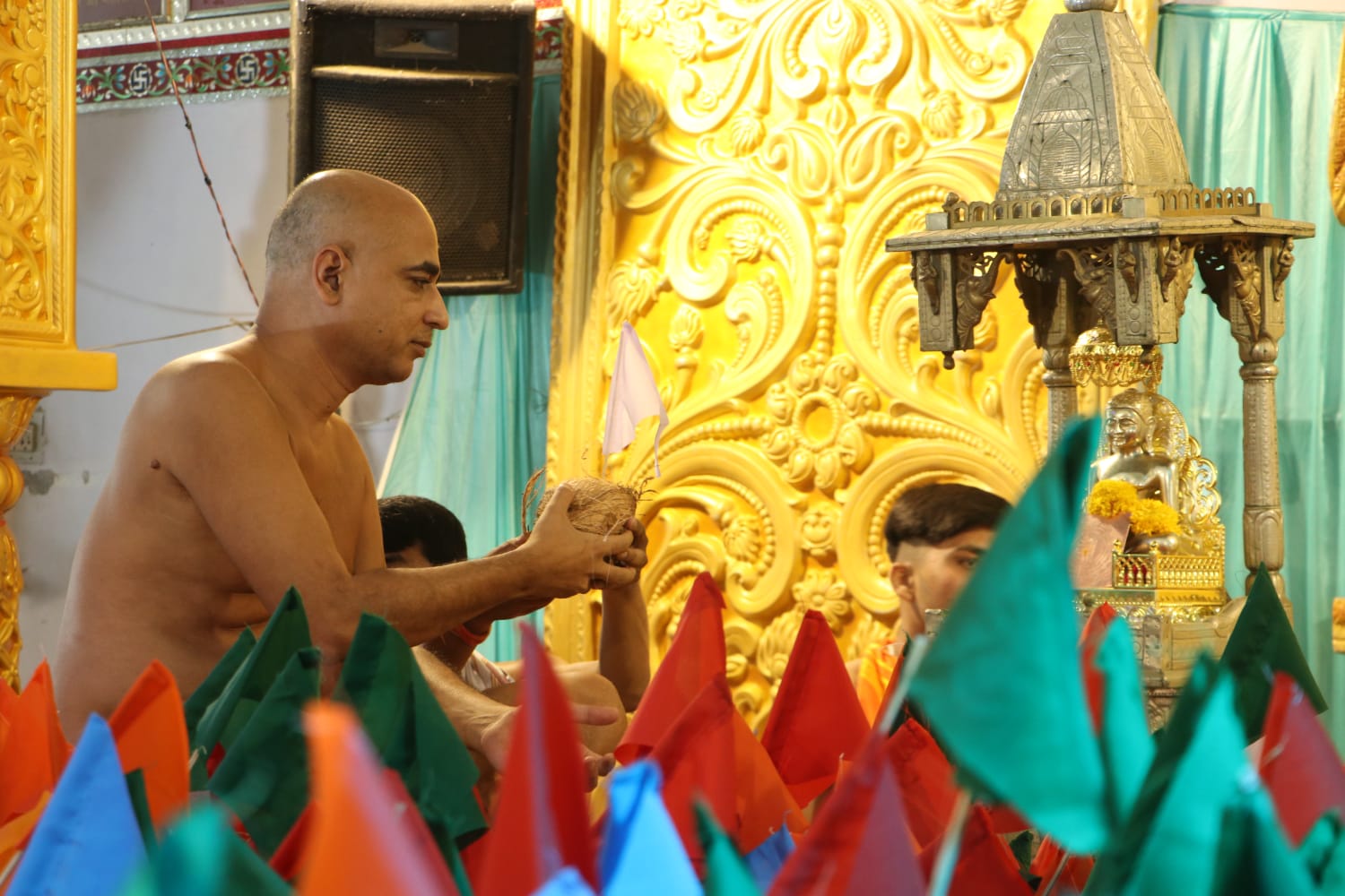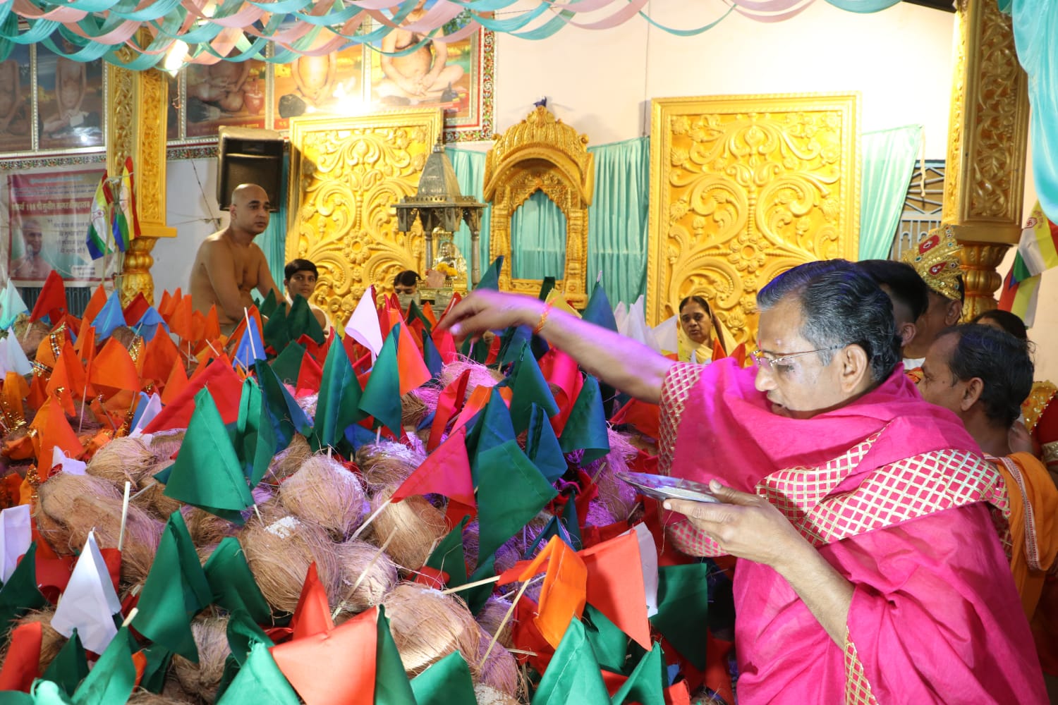 पारसोला। अंतर्मुखी मुनि पूज्य सागर महाराज, आर्यिका प्रसन्न मति माताजी और क्षुल्लक अनुश्रमण सागर के सानिध्य में चल रहे सात दिवसीय श्री भक्तामर महामंडल विधान अनुष्ठान के छठे दिन सात काव्य की आराधना करते हुए 392 श्रीफल के साथ 392 अर्घ्य सौधर्म इन्द्र अशोक जी घाटलिया परिवार ने समर्पित किए।