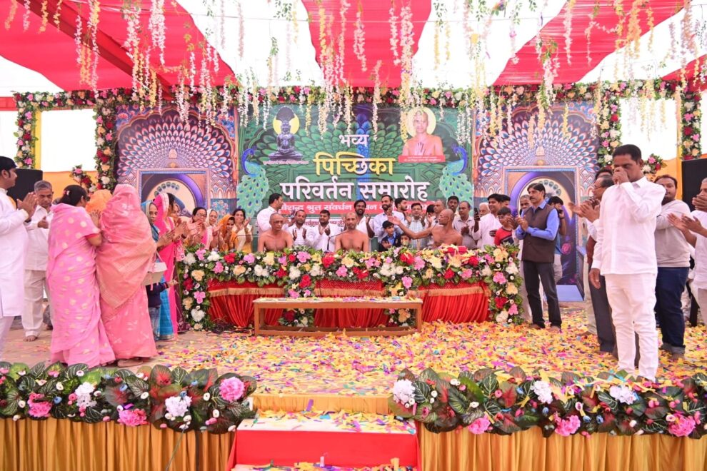 आगरा। पार्श्वधाम, छिपीटोला में विराजमान आचार्य श्री विशुद्ध सागर जी महाराज के परम् प्रिय शिष्य परम पूज्य मुनि श्री 108 साक्ष्य सागर जी महाराज, मुनि श्री 108 योग्य सागर जी महाराज, मुनि श्री 108 निवृत सागर जी महाराज जी संसघ के सानिध्य में भव्य पिच्छिका परिवर्तन समारोह बड़ी धूमधाम से मनाया गया। इस मौके पर श्रावक- श्राविकाओं ने पिच्छिका की शोभायात्रा निकाली और भक्ति संगीत पर नृत्य किया। पिच्छिका को बड़े आकर्षण ढंग से सजाया गया और उसको गाजे-बाजे के साथ कार्यक्रम स्थल तक लाया गया। मंच संचालन सतेंद्र जैन साहूला ने किया।