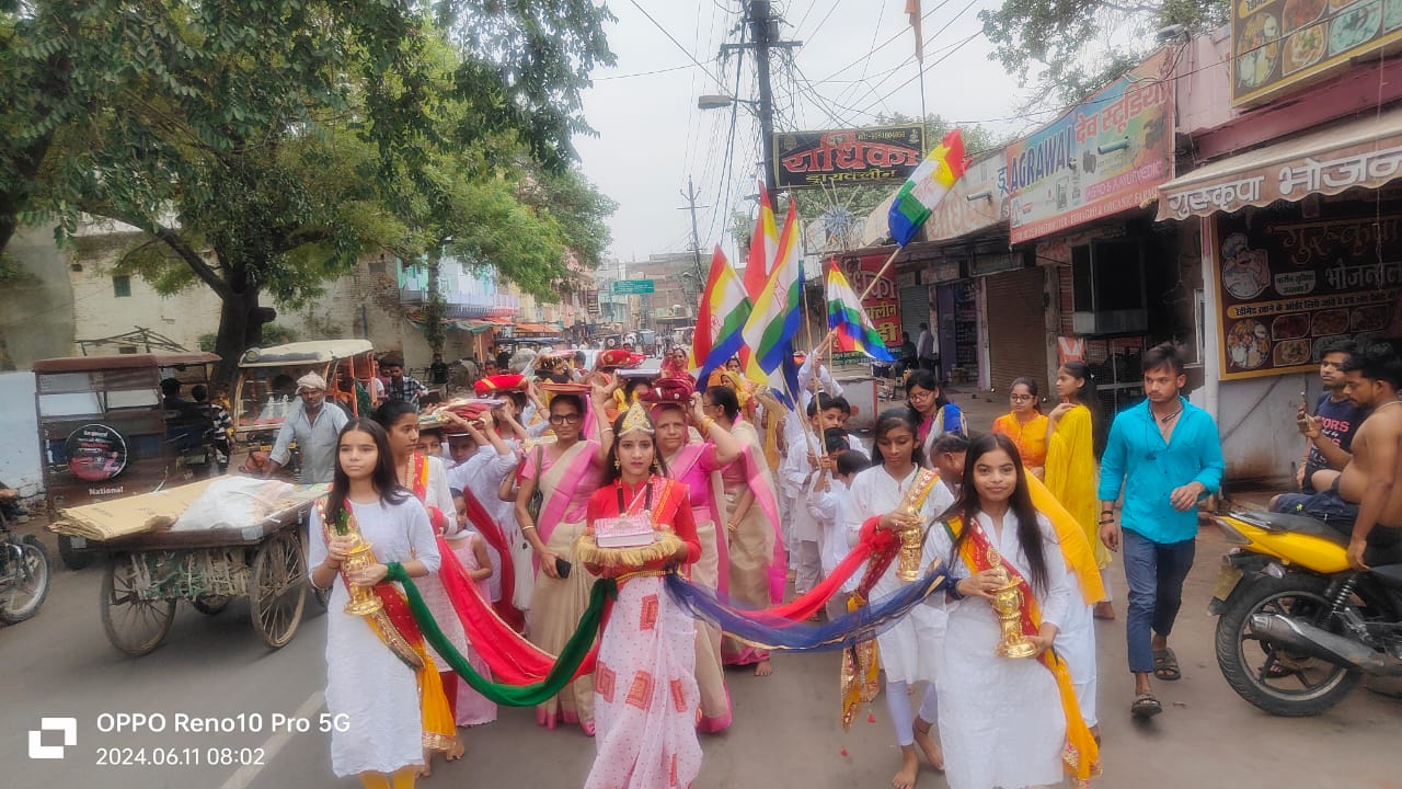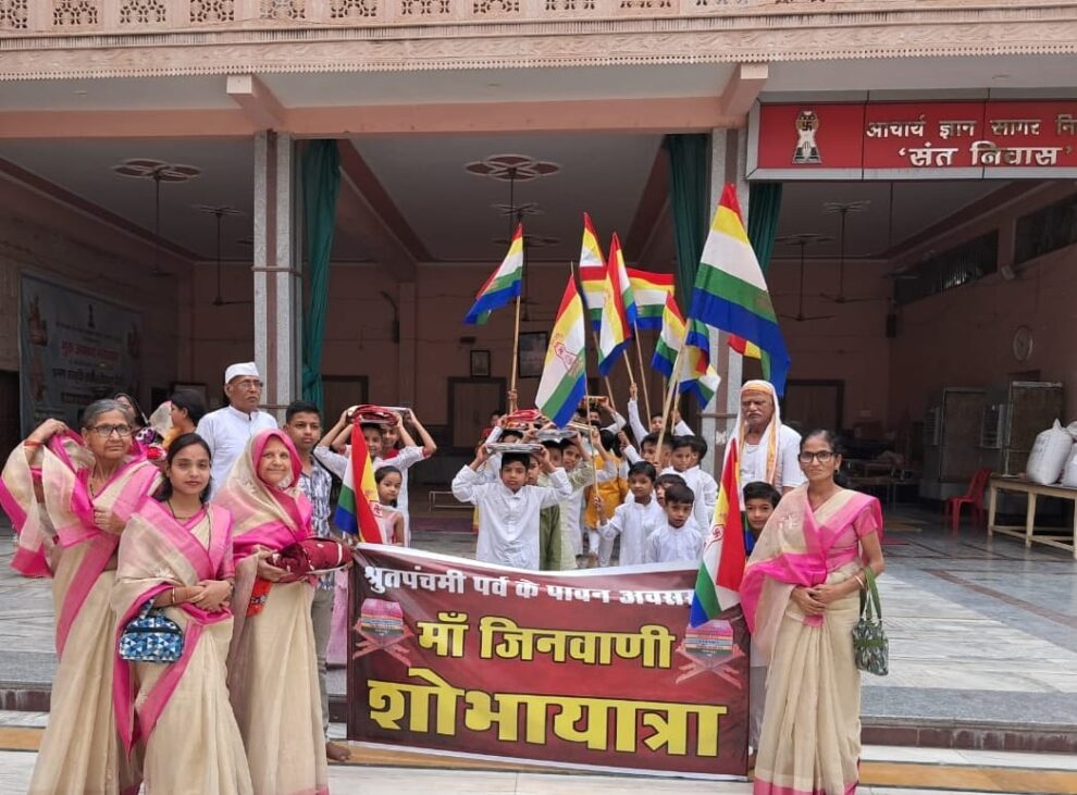 इस मौके पर सर्वोदय पाठशाला द्वारा श्रुत पंचमी के पावन अवसर पर जिनवाणी मां की आराधना की गई। पूज्य क्षुल्लिका अक्षतमति माताजी एवं क्षुल्लिका क्षयोपसम माताजी के पावन सान्निध्य में मां जिनवाणी को चांदी की पालकी में विराजमान कर ढोल एवं तांसों के साथ भव्य शोभायात्रा निकाली गई। शोभायात्रा बड़े जैन मंदिर से प्रारंभ होकर गोपीनाथ की पुलिया, पीपल वाली माता, रुई की मंडी, सदर बाजार, लोहिया बाजार होती हुई जैन मंदिर पहुंची। शोभायात्रा में जैन बंधु, माताएं, बहिनें एवं बच्चे अपने अपने सिर पर जिनवाणी लेकर चल रहे थे। सभी लोग एक विशेष परिधान में दिखाई दे रहे थे। युवा साथी हाथों में पचरंगी ध्वजा लेकर चलायमान थे। सभी जन जिनेंद्र प्रभु एवम मां जिनवाणी की जय जयकार करते हुए जैन धर्म की प्रभावना कारक नारे लगा रहे थे।