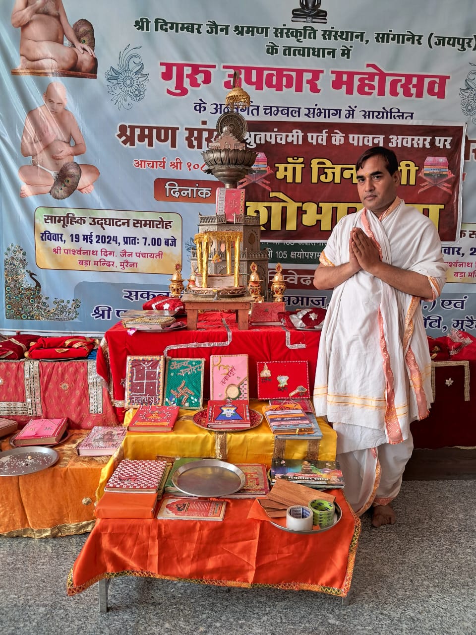 शोभा यात्रा के पश्चात मां जिनवाणी की पूजा-अर्चना की गई एवं श्री जिनेंद्र प्रभु का अभिषेक एवं शांतिधारा की गई। इससे एक दिन पूर्व जिनवाणी सजाओ प्रतियोगिता रखी गई। जिसमें प्रथम, द्वितीय, तृतीय एवं सांत्वना पुरस्कार प्रदान किए जाएंगे। इस अवसर मौजूद दोनों क्षुल्लिका माताजियों को शास्त्र भेंट किए गए। कार्यक्रम का निर्देशन पूर्व प्राचार्य महेंद्र कुमार शास्त्री, प्राचार्य चक्रेश शास्त्री एवं सफल संचालन विद्वत नवनीत जैन शास्त्री द्वारा किया गया ।