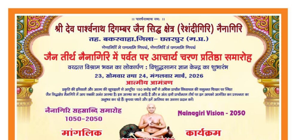 वरदत्तादि ऋषियों की पावन निर्वाण स्थली एवं तेईसवें तीर्थंकर भगवान पारसनाथ स्वामी की समवशरण/देशना स्थली, श्री दिगम्बर जैन सिद्धक्षेत्र (रेशंदीगिरि) नैनागिरि, तहसील बकस्वाहा, जिला छतरपुर (बुंदेलखंड, मप्र) की पावन भूमि पर सोमवार 23 एवं मंगलवार 24 मार्च 2026 को विभिन्न धार्मिक कार्यक्रमों के साथ भव्य समारोह का आयोजन किया जाएगा। पढ़िए यह विशेष रिपोर्ट…