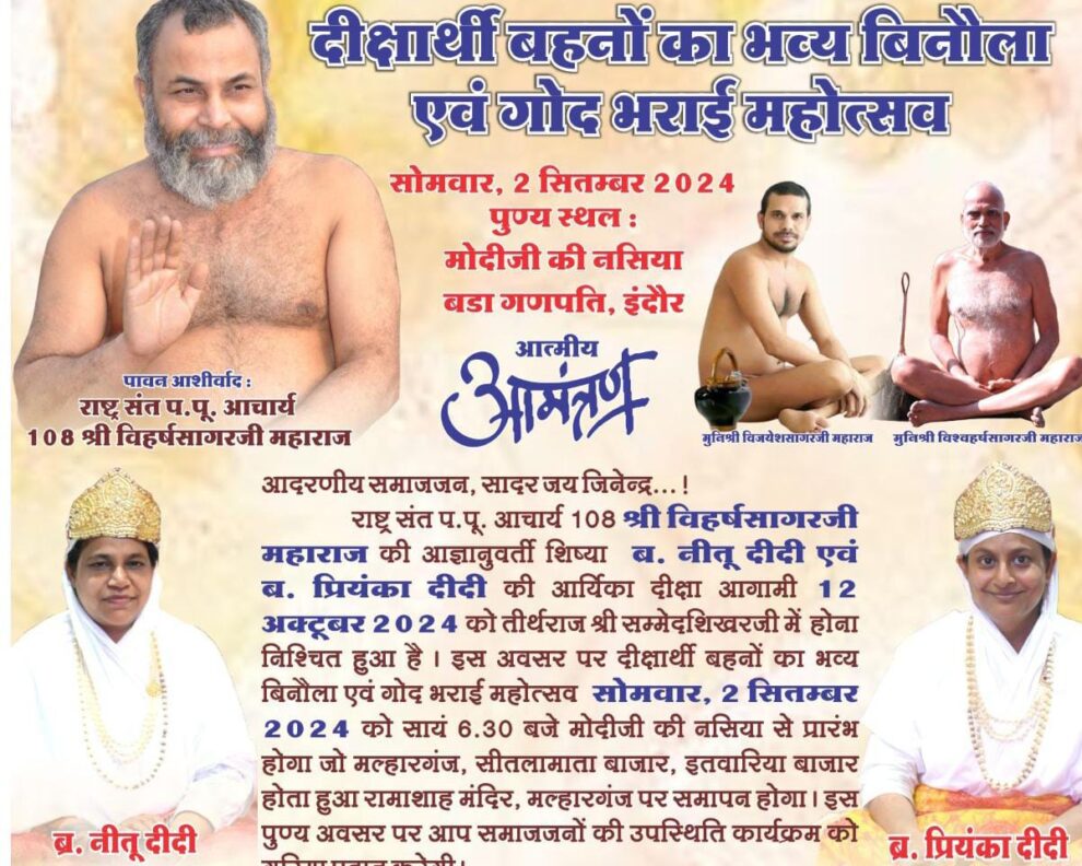 इंदौर। राष्ट्रसंत, तीर्थरक्षक शिरोमणि, वात्सल्य सरोवर आचार्य श्री 108 विहर्ष सागर महाराज की शिष्या बा.ब्रा.नीतू दी, बा.ब्रा. प्रियंका दी आदि 11 दीक्षाएं 12 अक्टूबर 2024 शनिवार को सिद्ध क्षेत्र सम्मेद शिखर में होने जा रही है। धर्म समाज प्रचारक राजेश जैन दद्दू ने बताया कि इस हेतु इंदौर में 2 सितंबर को पंच लश्करी गोठ रामाशाह मंदिर एवं मोदी जी की नसियां, विहर्ष भक्त मंडल के नेतृत्व में विनोली व गोद भराई का कार्यक्रम आयोंजित किया गया है।