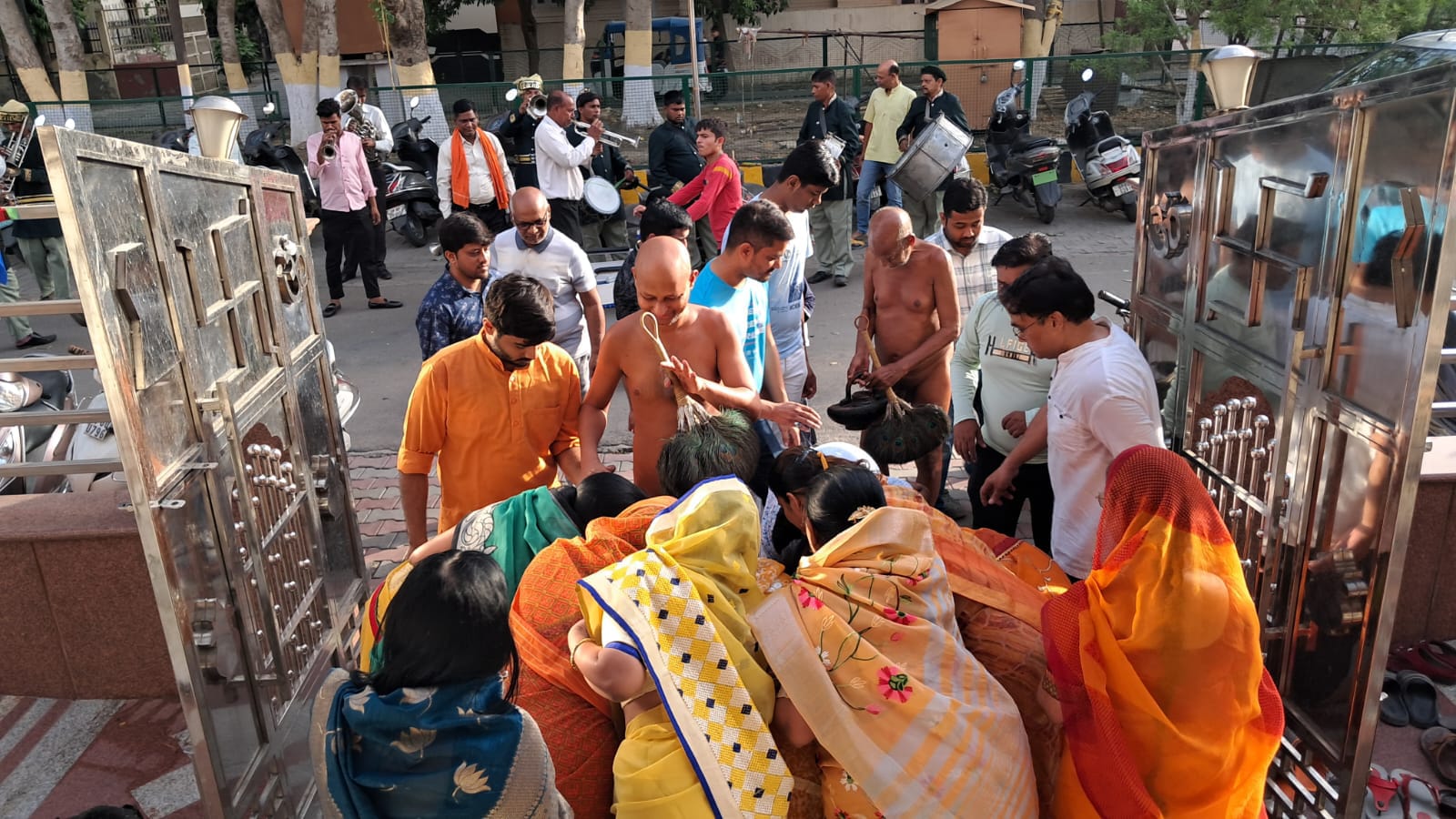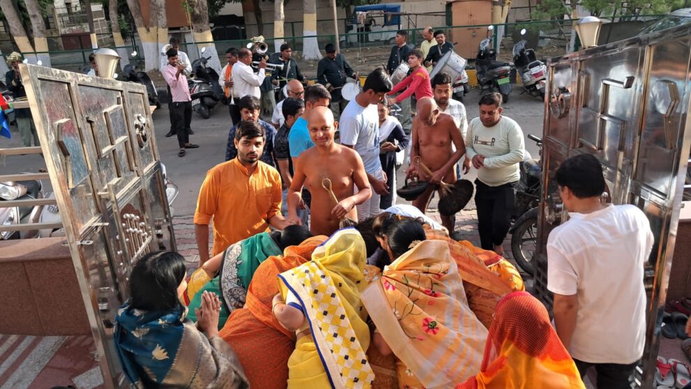 आगरा। 1 जून को मेडिटेशन गुरू उपाध्याय श्री विहसंतसागर जी महाराज एवं मुनिश्री विश्वसम्य सागर जी महाराज ससंघ आगरा के मोती कटरा स्थित श्री 1008 संभावनाथ दिगंबर जैन बड़ा मंदिर से हनुमान चौराहा आगरा कॉलेज,नालबंद चौराहा, जी जीआईसी ग्राउंड,कोठी मीना बाजार प्रतापनगर होते हुए बैण्ड- बाजों के साथ मंगल विहार कर जयपुर हाउस स्थित टीचर्स कॉलोनी के श्री शांतिनाथ दिगम्बर जैन मन्दिर पहुंचे। जहां भक्तों ने उपाध्यायश्री का पाद प्रक्षालन और मंगल आरती कर भव्य स्वागत किया और मंगल आशीर्वाद प्राप्त किया।मंगल आगवानी के बाद उपाध्यायसंघ ने मूलनायक भगवान शांतिनाथ की प्रतिमा के दर्शन किए। उपाध्यायश्री के मंगल प्रवेश में जयपुर हाउस की महिला मंडल अपने सिर पर मंगल कलश लेकर चल रही थी और पुरुष जैन ध्वज लेकर जयकारें लगाते हुए चल रहे थे|