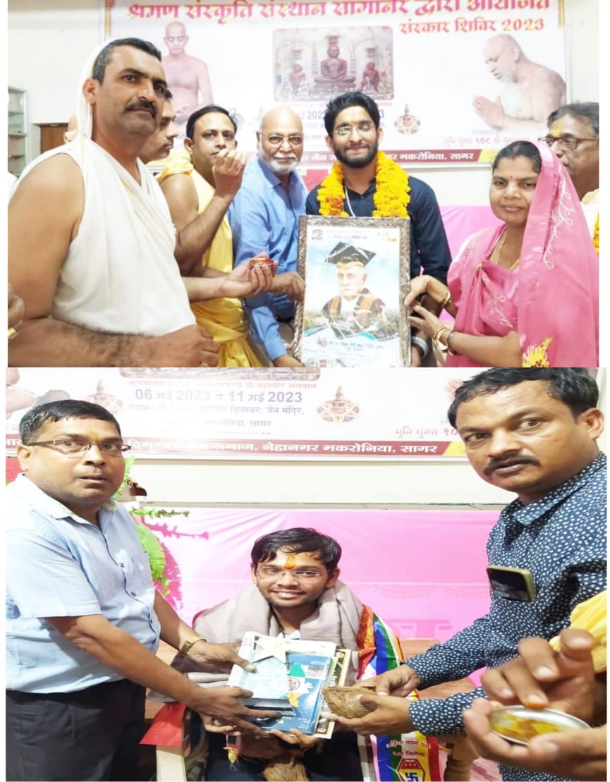 मकरोनिया चौराहे से जैन मंदिर तक सभी ने तिलक माला द्वारा घर के द्वारे पर स्वागत किया एवं बधाई दी। मंदिर जी में अभिषेक शांतिधारा के बाद दोनों का समाज की ओर से सम्मान समारोह का कार्यक्रम रखा गया जिसमें मंगलाचरण रूपचंद जैन मड़देवरा ने किया। मंदिर समिति के कार्यवाहक अध्यक्ष नीलेश जैन भूसा , महामंत्री अशोक जैन मड़देवरा ,संतोष चैन घड़ी ,मनोज बंगेला, डॉ अभय जैन, सुमित प्रकाश जैन ,राहुल जैन आयुष के पापा भागचंद जैन ने कहा कि आज मेरे बेटे के साथ नेहानगर समाज ने मेरा मान रखा इस पर सभी का आभार माना। बालक के विषय में अपनी पत्नी आशा जैन को श्रेय दिया। आशा जैन ने कहा कि मेरे द्वारा की जा रही भगवान की भक्ति का फल मिला। उन्होंने कहा कि मैं बहुत खुश हूं जो हमारे बेटा -बेटी सफलता के साथ संस्कारवान हैं । आयुष जैन ने अपने माता पिता बहिन के साथ आचार्य श्री विद्यासागर जी द्वारा रचित मूकमाटी महाकाव्य स्वाध्याय को अपनी सफलता का श्रेय दिया।