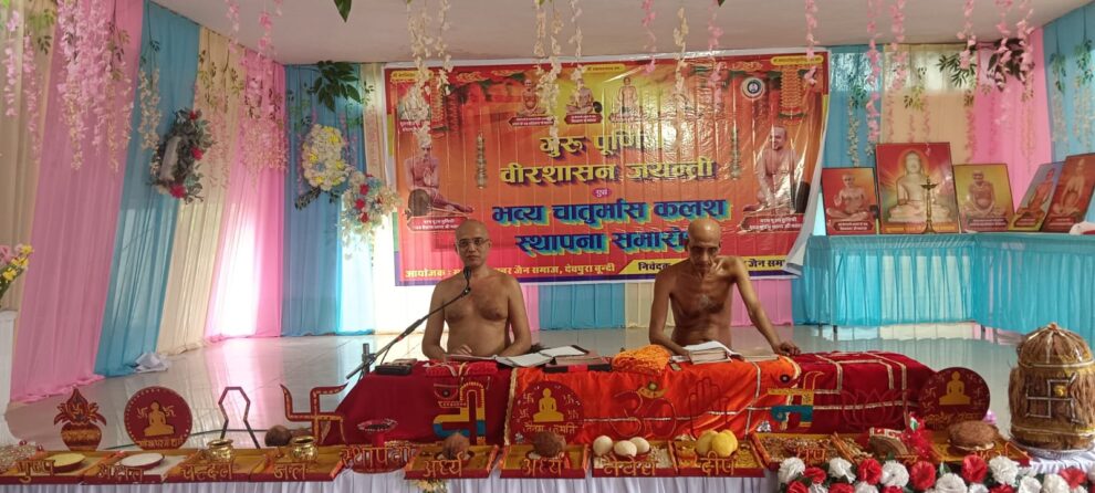 इससे पूर्व भगवान संभवनाथ की तस्वीर पर शांन्तीलाल प्रेमचंद अमित कुमार मोहिवाल ने दीप प्रज्वलन किया। मेवाड़ के सुधा सागर क्रांति मंच तथा बिजोलिया देवली टोंक नीमच, झातला,ठुकराई, पेच की बावड़ी, हिंडोली, कोटा डाबी आदि जगहों के सैकड़ो लोगों उपस्थित हुए, जैन संस्कार महिला मंडल, जिन शासन महिला मंडल, देवपुरा सकल दिगम्बर जैन समाज की महिला मंडल देवपुरा पाठशाला के बालक बालिकाओं, रजत महिला मंडल, मधुबन कॉलोनी महिला मंडल, संभवनाथ नवयुवक मंडल देवपुरा मन्दिर कार्यकारिणी के पदाधिकारी चातुर्मास समिति के सदस्यों ने भक्ति भाव पूर्वक अर्घ्य चढ़ाया। मुनि वैराग्य सागर जी महाराज का पाद पक्षालन रमेश चंद, अनिल कुमार सीदडातोड, शास्त्र भेंट लोकेशकुमार सेठिया महुआ, मुनि सुप्रभसागर सागर जी का पाद पक्षालन सिलोरिया हरसोरा परिवार ने तथा शास्त्र भंेट प्रेम बाई ने किया। सभी धार्मिक क्रियाएं पंडित देवेंद्र जैन, संगीतकार शुभम जैन ने संपन्न कराई। कार्यक्रम का संचालन ओम प्रकाश ठग ने किया।