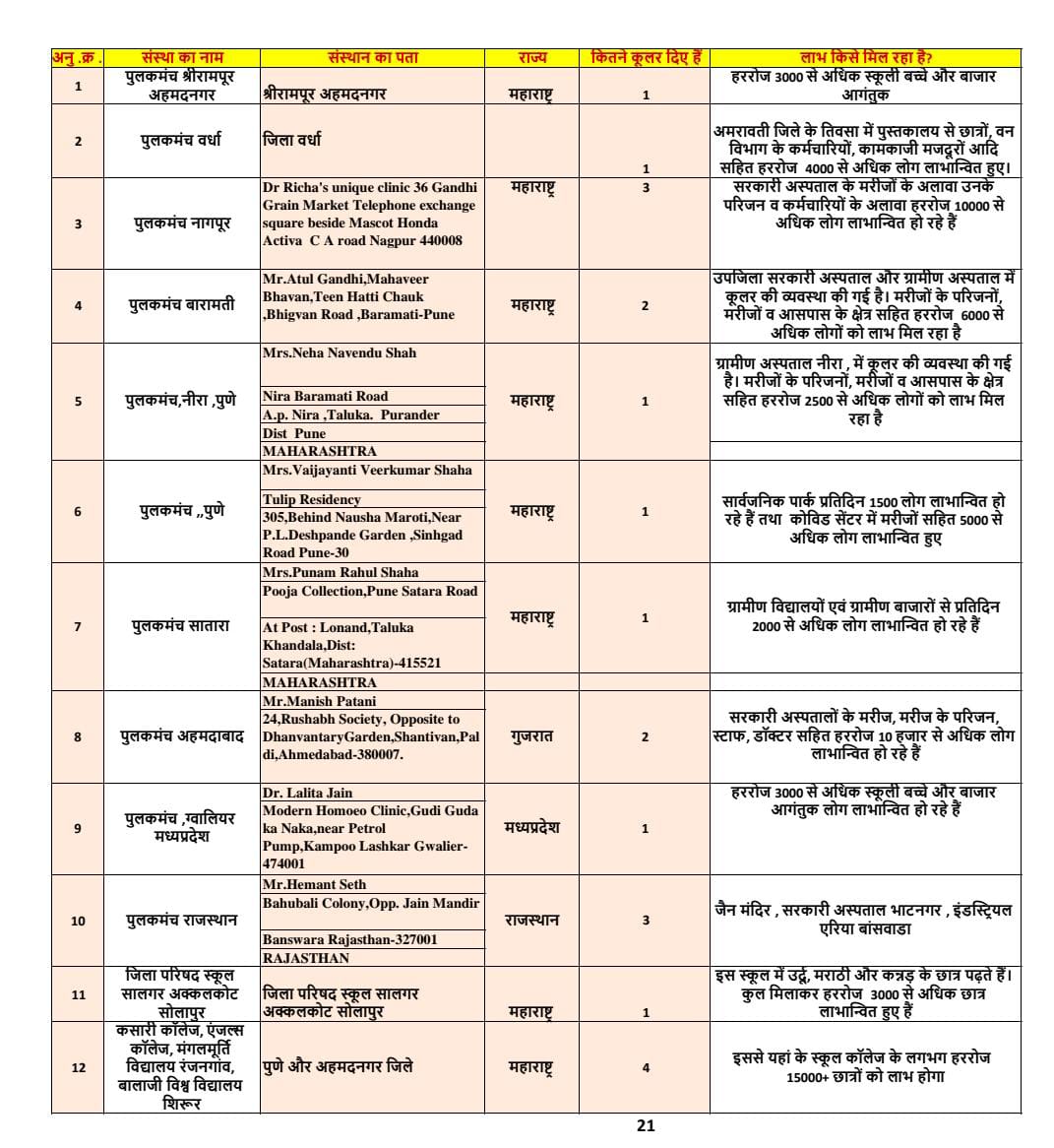 आचार्य श्री पुलक सागर जी की प्रेरणा से चल रही परोपकारी संस्थान पुलक संस्था ने देश भर में एक अनूठा कार्य करने का बीड़ा उठाया है । जिन संस्कृति की परोपकारी संस्कारों से ओत-प्रोत पुलक संस्था और आर.एम.डी ग्रुप परिवार की ओर से शोभा रसिकलाल धारीवाल जी के आर्थिक सहयोग से देश के चार राज्य, जिसमें महाराष्ट्र,गुजरात,राजस्थान और मध्यप्रदेश के 12 शहरों में 21 स्थानों पर निशुल्क प्याऊ स्थापित की है ।