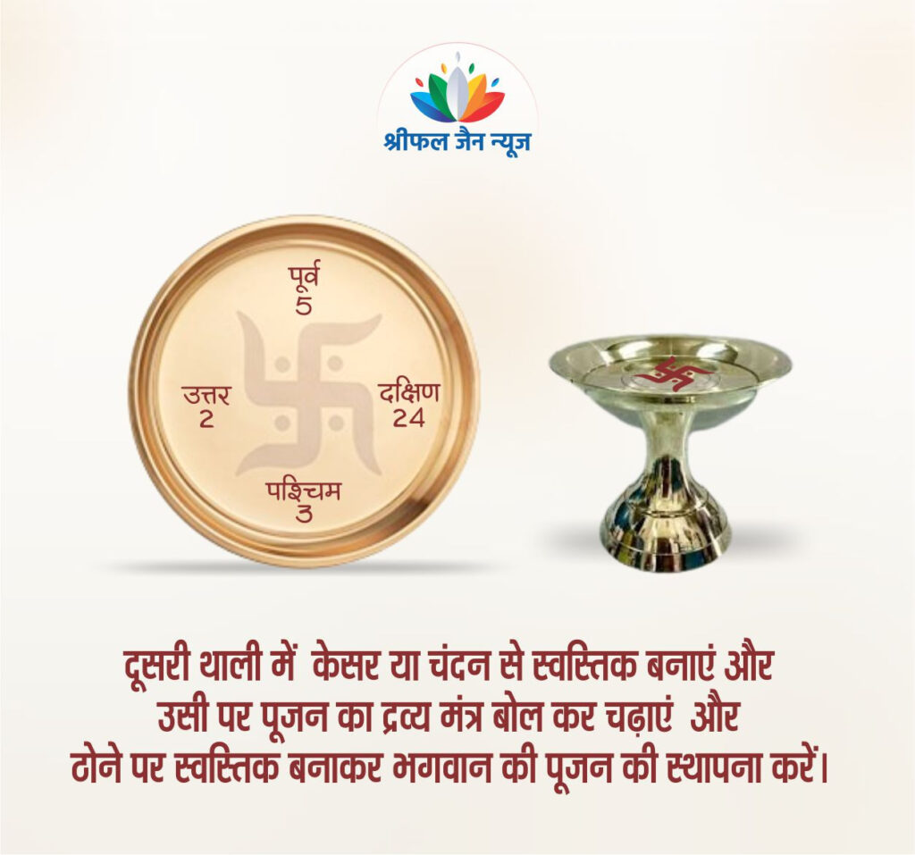 दूसरी थाली में केसर या चंदन से स्वस्तिक बनाएं और उसी पर पूजन का द्रव्य मंत्र बोल कर चढ़ाएं और ठोने पर स्वस्तिक बनाकर भगवान की पूजन की स्थापना करें।