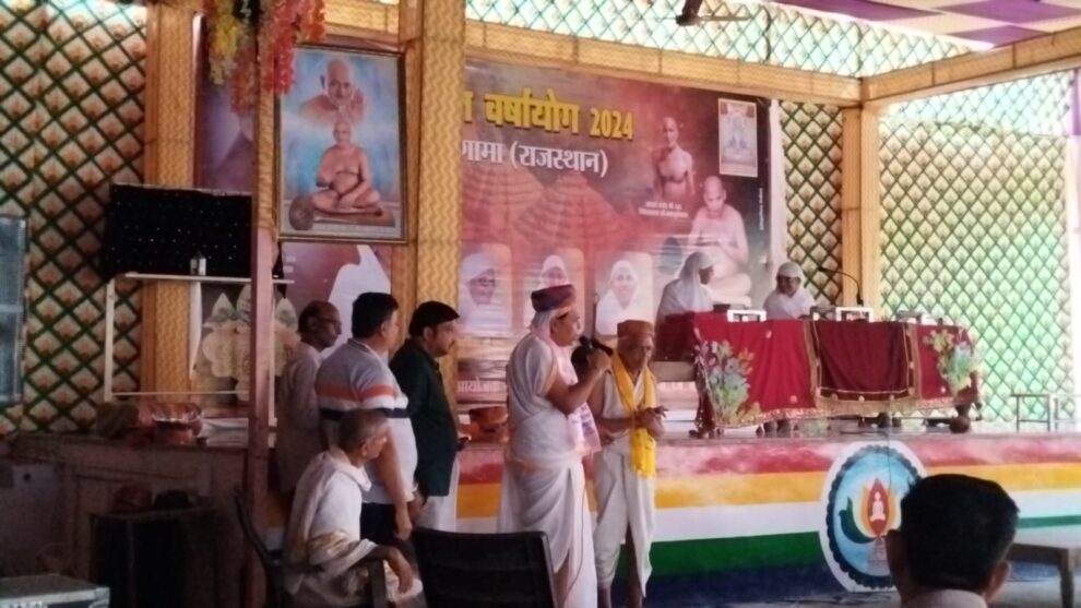 नौगामा। परम पूज्य पवित्रवती माताजी के सानिध्य में आज प्रातः 1008 आदिनाथ दिगंबर जैन मंदिर में शांति धारा अभिषेक का आयोजन किया गया। अभिषेक के पश्चात, चातुर्मास पंडाल में जैन पाठशाला के छात्रों द्वारा सामूहिक रूप से बड़े भक्ति भाव से पूजन किया गया। पूजन के बाद, माताजी का मंगल आगमन हुआ। रविवार होने के कारण, हार्ड पिपलिया, घाटोल, बागीदौरा, इंदौर से पधारे दर्शनार्थियों का श्री समाज चातुर्मास कमेटी द्वारा पगड़ी पहनाकर, तिलक लगाकर और दुपट्टा उड़ाकर सम्मान किया गया। सम्मान के बाद, रेखा जैन और विजेंद्र नानावटी ने मृदुल स्वर में मंगलाचरण किया। मंगलाचरण के बाद, पवित्रवती माताजी ने मंगल प्रवचन दिया।