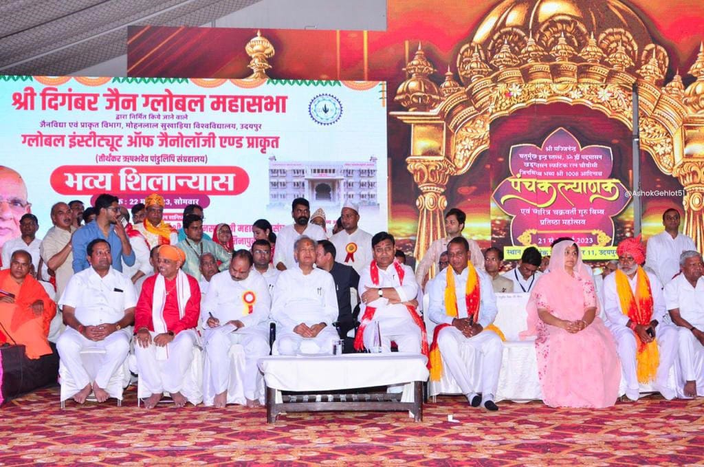 जयपुर। मुख्यमंत्री अशोक गहलोत ने सोमवार को उदयपुर के मोहनलाल सुखाड़िया विश्वविद्यालय में ग्लोबल इंस्टीट्यूट ऑफ जैनोलॉजी और प्राकृत भवन का शिलान्यास किया। उन्होंने पंच कल्याणक महोत्सव में आचार्य वर्द्धमान सागर महाराज का आशीर्वाद भी लिया।