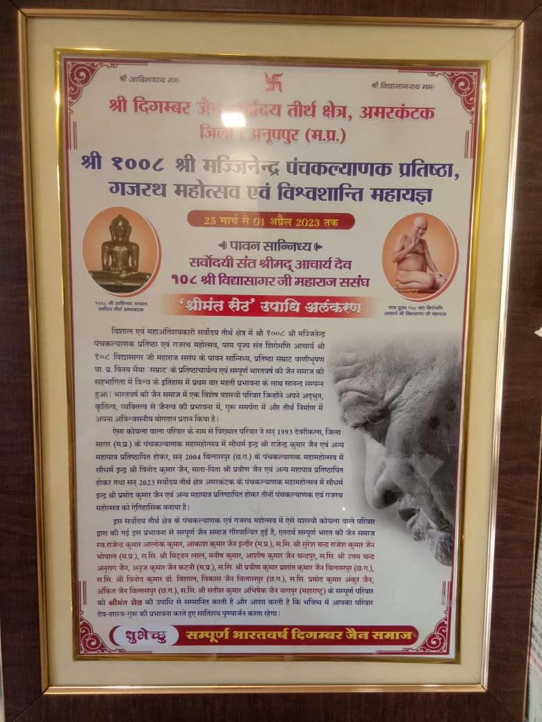 इंदौर (राजेश जैन दद्दू)। जैन समाज गौरव परिवार कोयला परिवार को हाल ही में सम्पन्न अमरकंटक में पंचकल्याणक महोत्सव में महामहिम आचार्यश्री विद्यसागर जी महाराज के सानिध्य में श्रीमंत सेठ की उपाधि से अलंकृत किया गया।