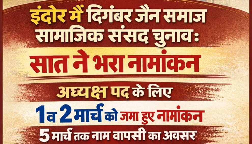 इंदौर में दिगंबर जैन समाज सामाजिक संसद चुनाव: सात ने भरा नामांकन : अध्यक्ष पद के लिए 1 व 2 मार्च को जमा हुए नामांकन, 5 मार्च तक नाम वापसी का अवसर