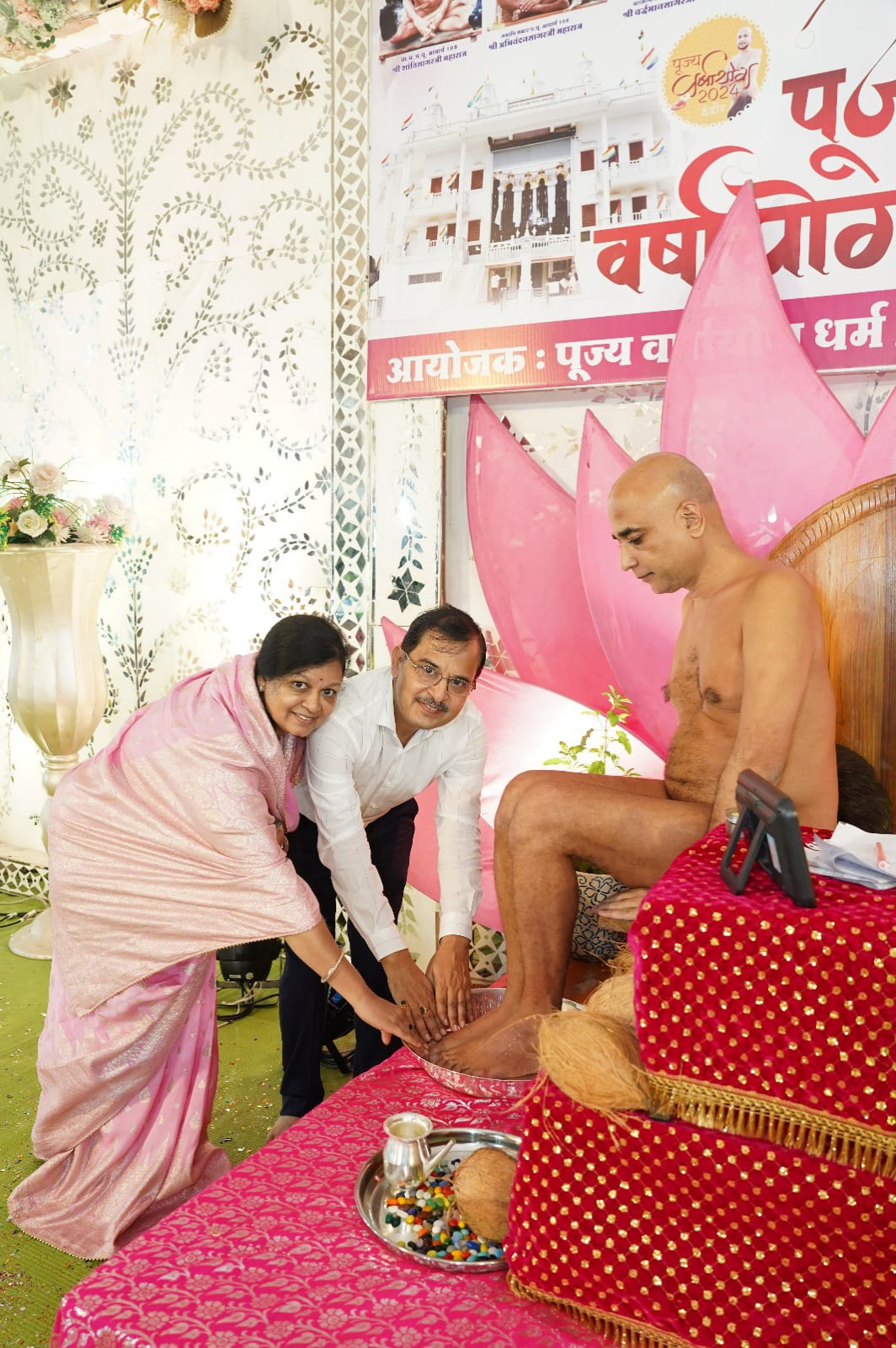 पूज्य वर्षायोग 2024 के कार्यक्रम के दौरान ध्वजारोहण और मंगल कलश स्थापना का आयोजन आरके जैन-रानेका इंडस्ट्री, भरत ऋतू जैन, जितेंद्र मोनिका जैन और निमिष टीना जैन के साथ किया गया, व पाद-प्रक्षालन कमलेश टीना, संजय सपना पापड़ीवाल, रेखा संजय जैन द्वारा किया गया। गुरुदेव ने इस अवसर पर कहा कि जीवन में पुण्य का महत्व अतुलनीय है और यह केवल देव, शास्त्र और गुरु की पूजा के माध्यम से ही प्राप्त किया जा सकता है। उन्होंने बताया कि जिस प्रकार हमारे घर में प्रत्येक सदस्य के लिए अलग-अलग वाहन और कमरे होते हैं, उसी प्रकार प्रत्येक परिवार के सदस्य को अपने पुण्य का संचय स्वयं करना चाहिए।