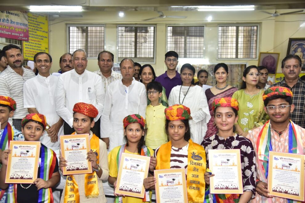 इंदौर। दिगंबर जैन आम समाज संगठन एवं श्रुति फाउंडेशन इंदौर की ओर से मेधावी विद्यार्थियों का सम्मान एवं शिक्षा सहायता योजना के अंतर्गत प्रतिवर्ष प्रदान की जाने वाली छात्रवृत्ति के फार्म का वितरण रविवार को गौराकुंड स्थित दिगंबर जैन लश्करी मंदिर में किया गया। इस अवसर पर मोटिवेशनल स्पीकर उन्नित झांझरी मुख्य अतिथि और कल्पवृक्ष हीलिंग फाउंडेशन की प्रियंका शाह विशेष अतिथि थीं। संगठन प्रमुख इंद्रकुमार वीणा सेठी ने बताया कि इस वर्ष कक्षा पांचवीं, आठवीं, दसवीं और बारहवीं के परीक्षा परिणामों में सर्वाेच्च अंक से उत्तीर्ण होने वाले सौम्या स्वप्निल जैन, सानवी सौरभ पाटोदी, आर्विश दीपक जैन, इशिता विद्याधर सेठी, ऋषित कपिल जैन, काव्या नीलेश जैन सहित अन्य विद्यार्थियों को अतिथियों ने साफा एवं माला पहनाकर प्रमाण पत्र भेंटकर सम्मानित किया।
