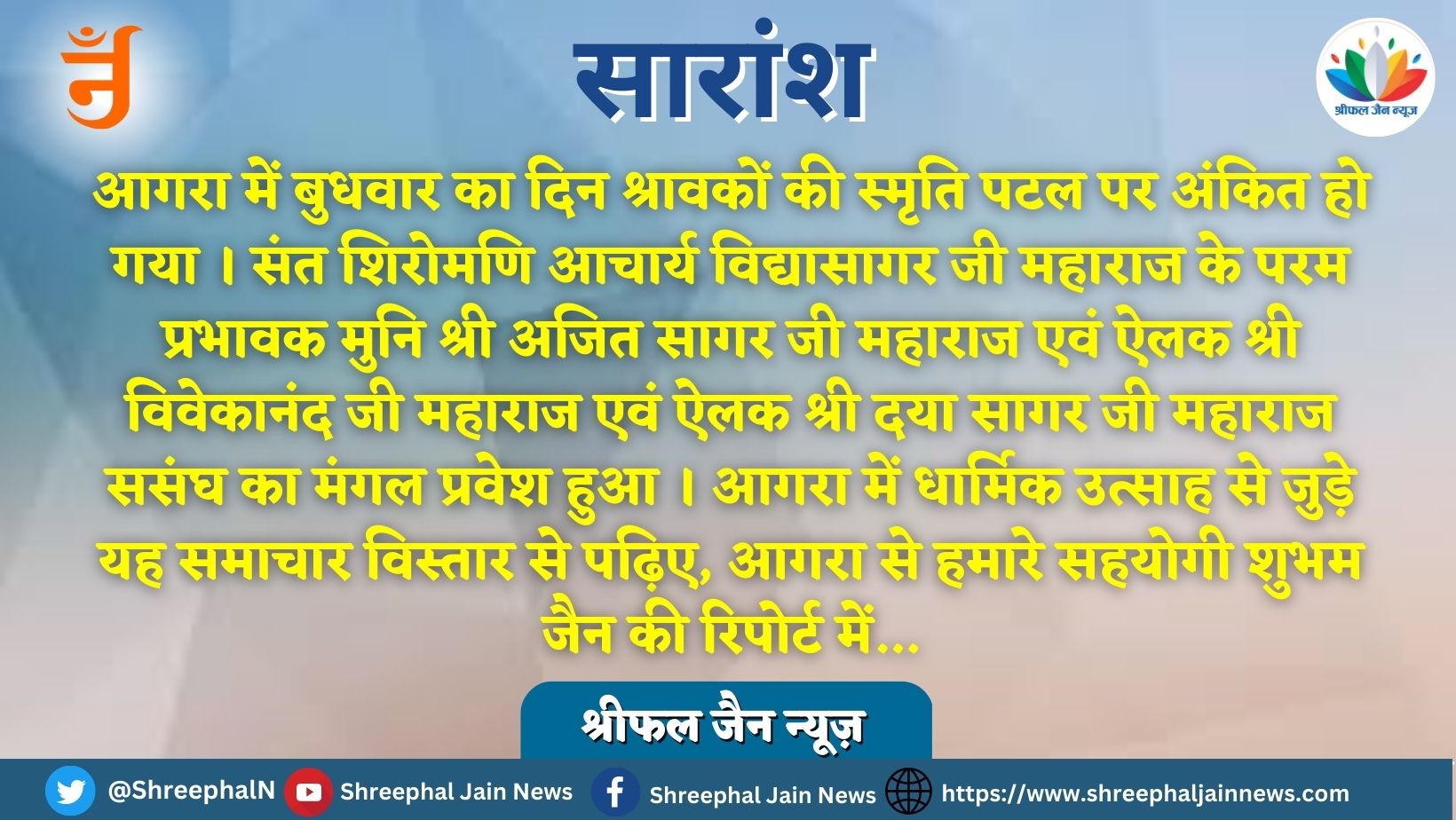 आगरा के हरीपर्वत स्थित श्री 1008 शांतिनाथ दिगंबर जैन मंदिर एम.डी जैन इंटर कॉलेज अहिंसा चौक की पावनधरा पर प्रथम बार भव्य मंगल प्रवेश हुआ । मुनिसंघ मंगल विहार छीपीटोला जैन भवन से माध्यम दोपहर 1:00 बजे, बैंड बाजों के साथ मोती कटरा के बड़े मंदिर के दर्शन किए ।