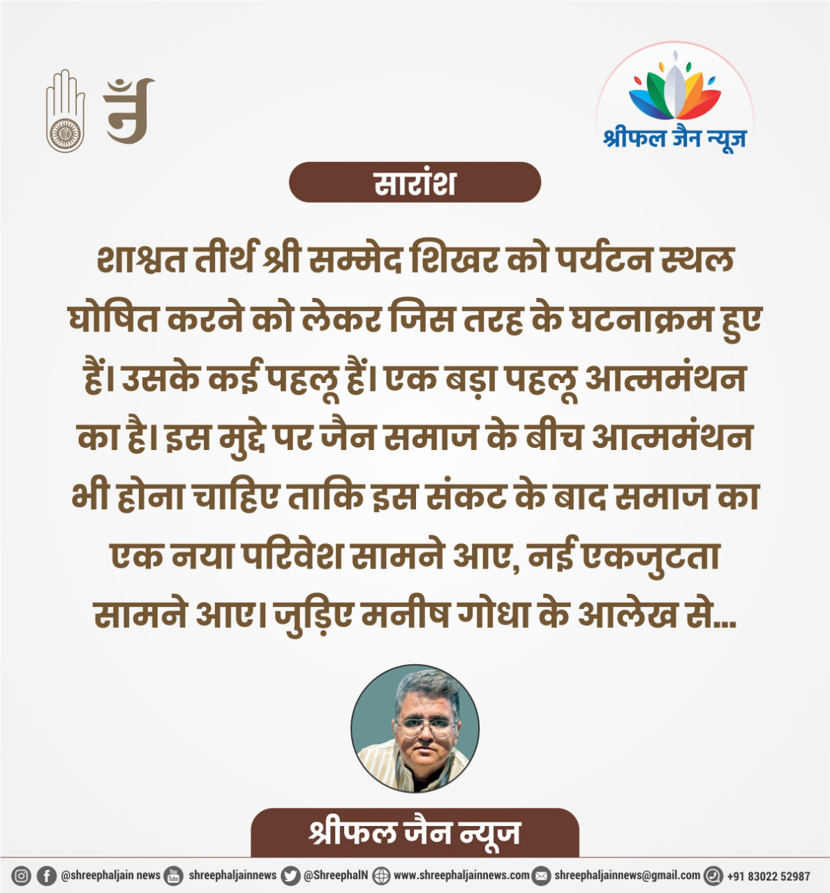 मनीष गोधा- शाश्वत तीर्थ श्री सम्मेद शिखर जी को पर्यटन स्थल घोषित किए जाने के विरोध में देश भर में आंदोलन चल रहे हैं । जैन समाज सडकों पर है और पूरे देश से इस आदेश के खिलाफ आवाज उठ रही है, लेकिन सिर्फ आंदोलन से काम नहीं चलेगा ।