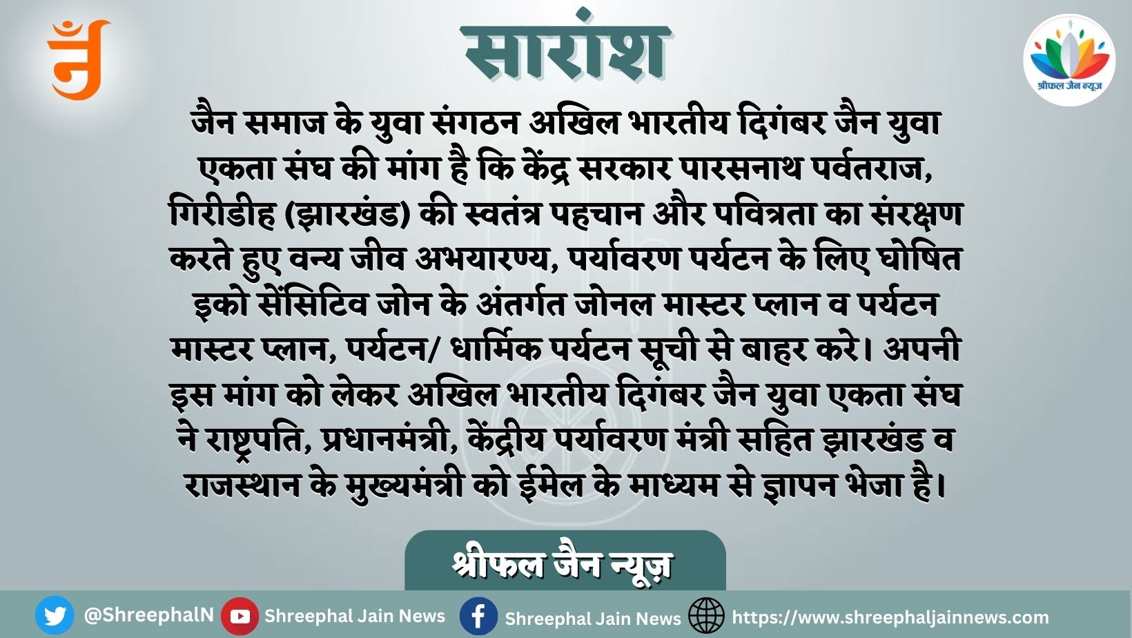 जैन युवा एकता संघ की मांग है कि केंद्र सरकार पारसनाथ पर्वतराज, गिरीडीह (झारखंड) की स्वतंत्र पहचान और पवित्रता का संरक्षण करते हुए वन्य जीव अभयारण्य, पर्यावरण पर्यटन के लिए घोषित इको सेंसिटिव जोन के अंतर्गत जोनल मास्टर प्लान व पर्यटन मास्टर प्लान, पर्यटन/ धार्मिक पर्यटन सूची से बाहर करे। अपनी इस मांग को लेकर अखिल भारतीय दिगंबर जैन युवा एकता संघ ने शुक्रवार को राष्ट्रपति, प्रधानमंत्री, केंद्रीय पर्यावरण मंत्री सहित झारखंड व राजस्थान के मुख्यमंत्री को ईमेल के माध्यम से ज्ञापन भेजा है।