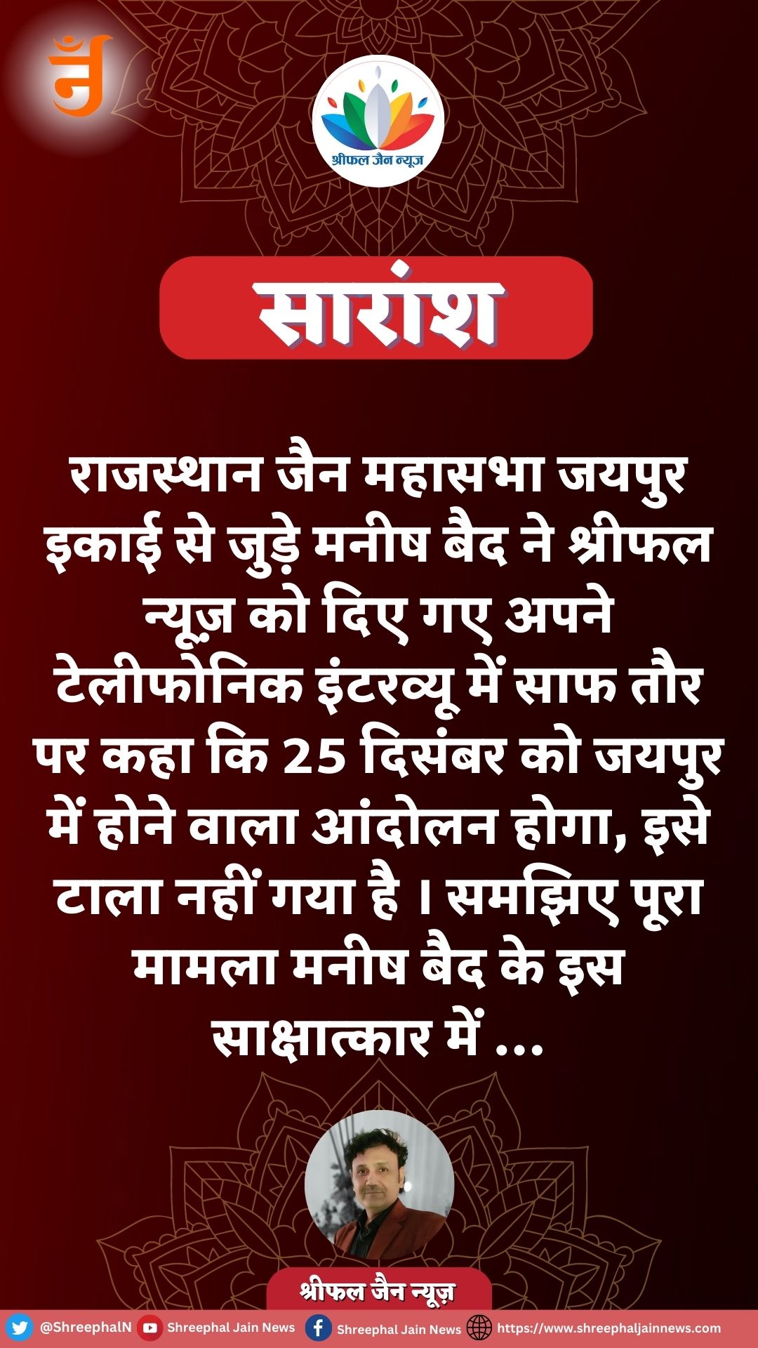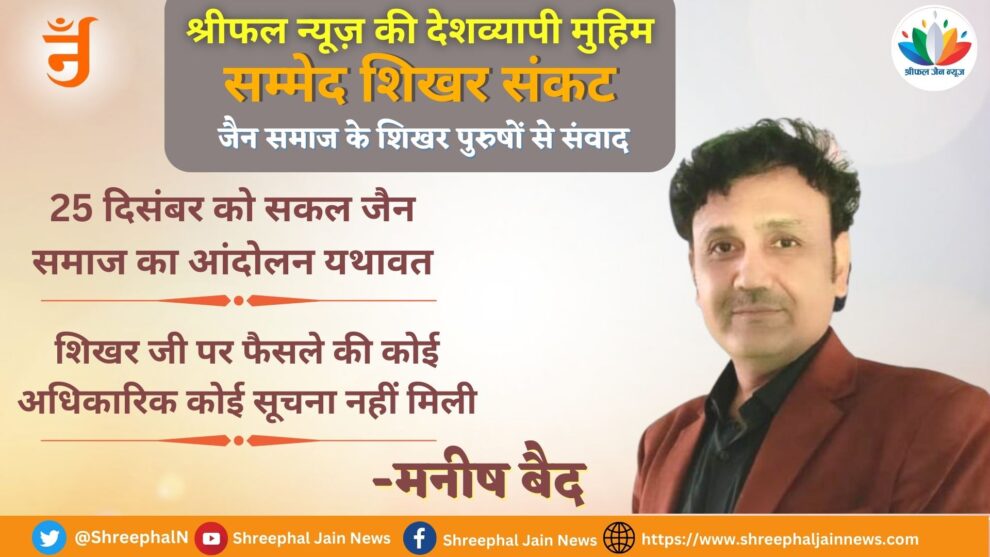 मनीष बैद, राजस्थान जैन महासभा – सिर्फ एक टीवी चैनल पर इस बारे में खबर प्रसारित की गई है । इसके अलावा जैन समाज के पास कोई विश्वसनीय जानकारी नहीं है कि झारखंड सरकार ने अपना नोटिफिकेशन व आदेश वापस लिया है या नहीं । ये जैन समाज में भ्रम फैलाने वाली चीजें हैं । 25 दिसंबर को हर हाल में जयपुर में सकल जैन समाज, जिसमें दिगंबर और श्वेताबंर शामिल हैं । बड़ी संख्या में आंदोलन के लिए जयपुर की सड़कों पर होंगे । इसे बिल्कुल भी टाला नहीं जाएगा ।