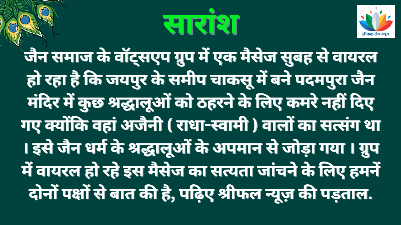 जयपुर के समीप जैन समाज के पवित्र धाम पदमपुरा जी तीर्थ में ठहरने की व्यवस्थाओं को लेकर जैन समाज के विविध ग्रुप्स में छिंदवाड़ा के संजय बज का मैसेज वायरल हो रहा है । इस मैसेज में बताया गया कि कैसे जैन संस्थाओं की अजैनियों के लिए बुकिंग हो गई और जैन श्रद्धालूओं को वहां कमरे तक नहीं मिले ।