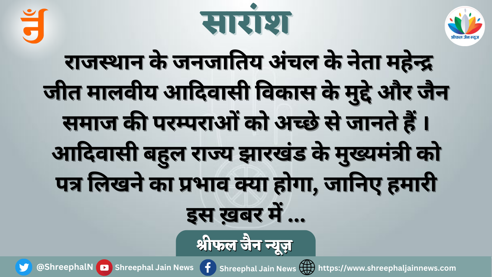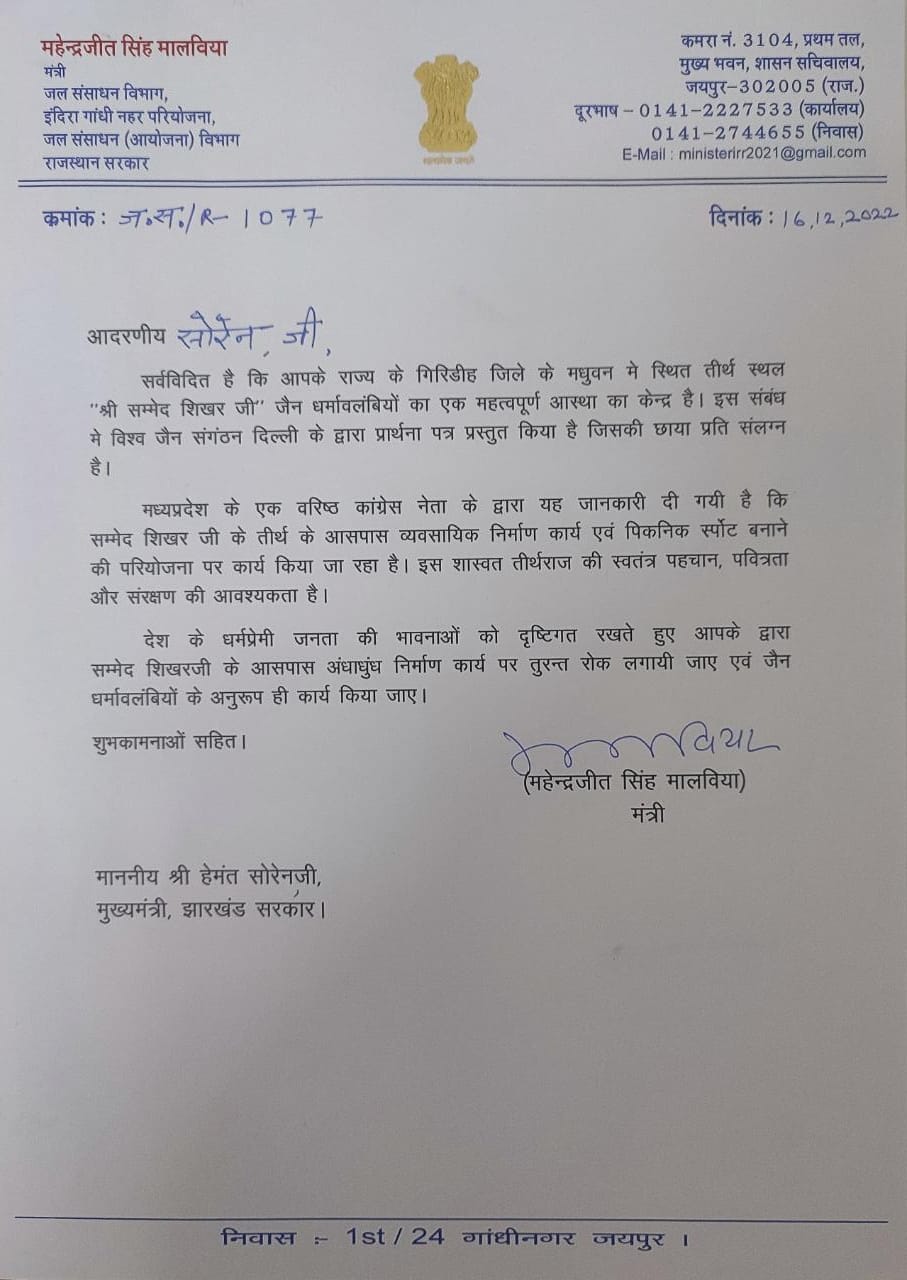 बांसवाड़ा @तुष्टि जैन । राजस्थान के जल संसाधन मंत्री महेन्द्र जीत सिंह मालवीय ने झारखंड के मुख्यमंत्री हेमंत सोरेन को पत्र लिखा है । मंत्री मालवीय ने झारखंड के गिरडीह जिले में स्थित मधुवन में जैन समुदाय की आस्था स्थली सम्मेद शिखर पर पिकनिक स्पॉट व मनोरंजक गतिविधियों के केन्द्र बनाने की योजना पर काम तुरंत प्रभाव से रोकने की बात कही है ।