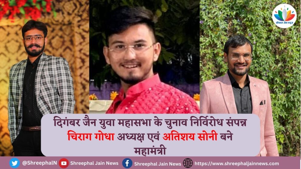 इंदौर। भारतवर्षीय दिगम्बर जैन युवा महासभा, संभाग इंदौर के चुनाव निर्विरोध संपन्न हुए। पदाधिकारियों में अध्यक्ष श्री चिराग गोधा, महामंत्री श्री अतिशय सोनी, महासचिव प्रमोद पहाड़िया एवं युवा प्रचार मंत्री अतिशय राजेश दद्दू निर्विरोध मनोनीत हुए।