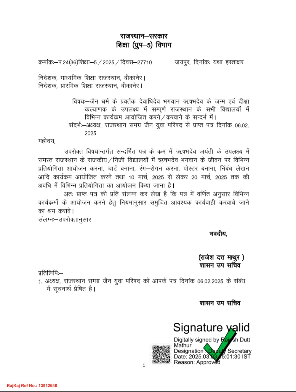 इस अवसर पर श्रमण डॉ. पुष्पेंद्र मुनी और राजस्थान समग्र जैन युवा परिषद् के संरक्षक अशोक बांठिया ने बताया कि ऋषभनवमी (23 मार्च) के अवसर पर शिक्षा विभाग के द्वारा विद्यालयों में विभिन्न प्रकार की प्रतियोगिताओं का आयोजन करवाना शिक्षा विभाग की अभिनव पहल है। इसके लिए राजस्थान समग्र जैन युवा परिषद् के द्वारा राजस्थान सरकार के समक्ष निवेदन किया था। प्रारंभिक और माध्यमिक शिक्षा विभाग के अंतर्गत आने वाले विद्यार्थी इन प्रतियोगिताओं में भाग लेंगे जिन्हे प्रथम और द्वितीय एवं तृतीय स्थान प्राप्त करने पर प्रशस्ती-पत्र प्रदान किया जाएगा।