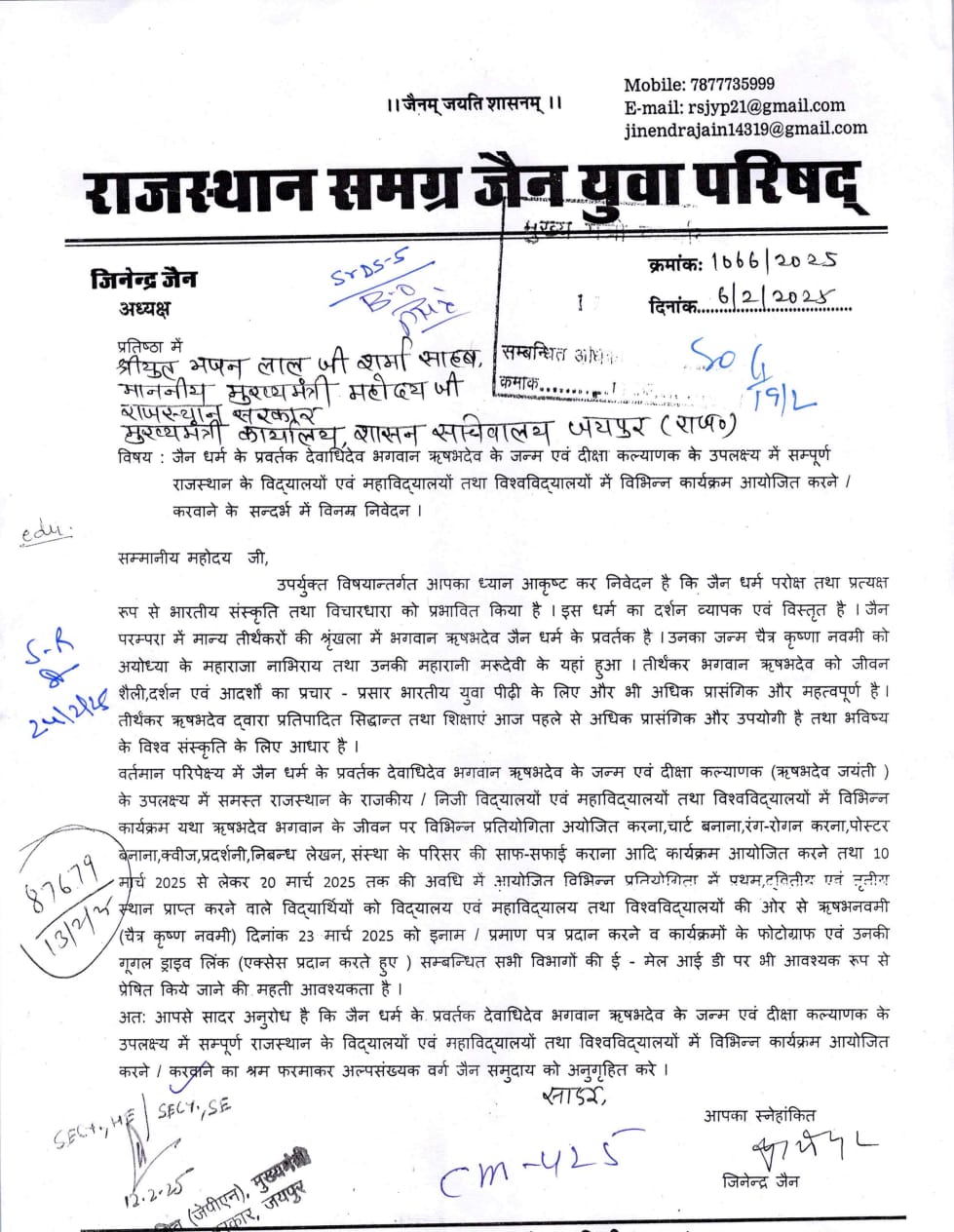 जयपुर। जैन धर्म के प्रवर्तक देवाधिदेव भगवान ऋषभदेव के जन्म एवं दीक्षा कल्याणक महोत्सव के उपलक्ष्य में राजस्थान के सभी विद्यालयों में विभिन्न कार्यक्रम आयोजित करने का फैसला कर राजस्थान सरकार के मुखिया माननीय मुख्यमंत्री भजनलाल शर्मा ने अल्पसंख्यक वर्ग के जैन समुदाय को अनूठा उपहार दिया है। जिससे जैन समुदाय में खुशी की लहर दौड़ पड़ी है। राजस्थान सरकार के शिक्षा विभाग के ग्रुप-5 के शासन उप-सचिव राजेश दत्त माथुर ने निदेशक माध्यमिक और प्रारंभिक शिक्षा विभाग को आदेश जारी किए हैं।