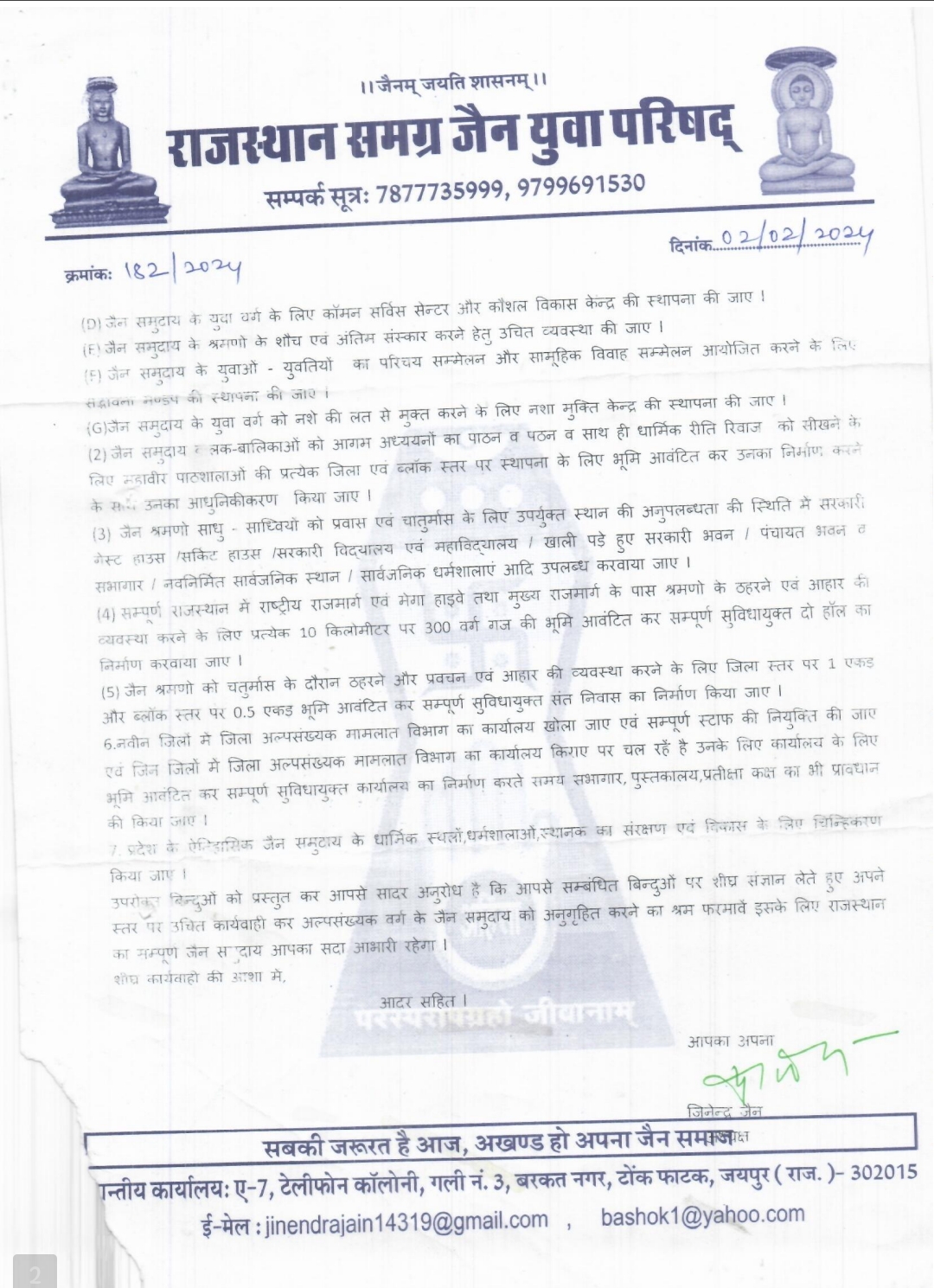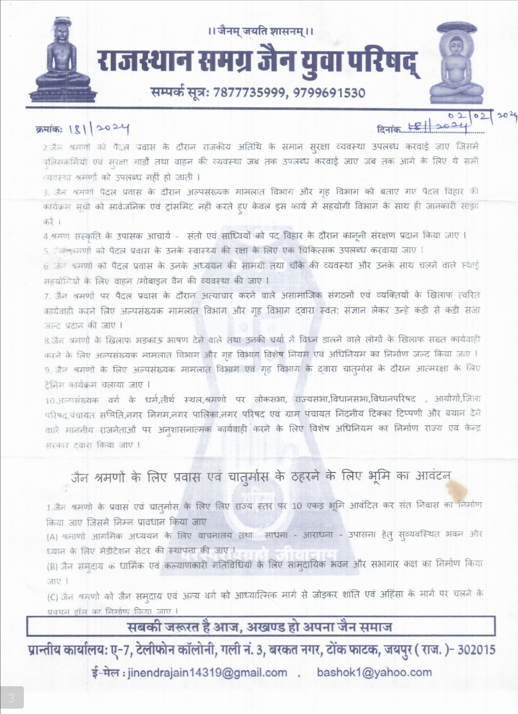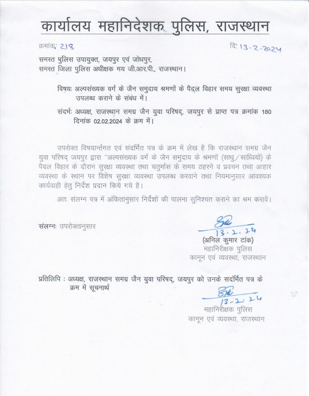 जयपुर। राजस्थान के मुख्यमंत्री भजनलाल शर्मा और गृह विभाग तथा पुलिस महनिदेशक के निर्देश पर राजस्थान के कानून एवं व्यवस्था के महानिरीक्षक अनिल कुमार टांक द्वारा अल्पसंख्यक वर्ग के जैन समुदाय के श्रमणों (साधु / साध्वियों ) के पैदल विहार के दौरान सुरक्षा व्यवस्था तथा चातुर्मास के समय ठहरने, प्रवचन तथा आहार व्यवस्था के स्थान पर विशेष सुरक्षा उपलब्ध करवाने के लिए राजस्थान समग्र जैन युवा परिषद् के पत्र के अनुसार नियमानुसार आवश्यक कार्यवाही करने के लिए समस्त पुलिस उपायुक्त एवं पुलिस अधीक्षक मय जी आर.पी निर्देश प्रदान करने से सम्पूर्ण राजस्थान में प्रवास कर रहे श्रमणों एवं जैन समुदाय में खुशी की लहर दौड़ पड़ी है l इस अवसर पर सम्पूर्ण जैन समुदाय ने राजस्थान सरकार के मुखिया एवं शासन – प्रशासन का आभार प्रकट करते हुए धन्यवाद ज्ञापित किया हैl राजस्थान समग्र जैन युवा परिषद् के संरक्षक अशोक बांठिया एवं अध्यक्ष जिनेन्द्र जैन लगातार विगत कई वर्षों से मांग कर रहे थेl