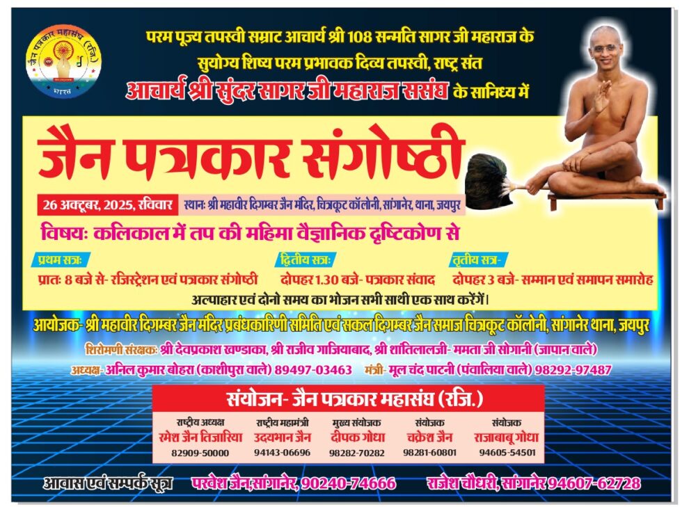 आचार्य श्री 108 सन्मति सागर जी महाराज के शिष्य आचार्य श्री सुंदर सागर जी महाराज ससंघ के पावन सानिध्य में जैन पत्रकार संगोष्ठी 26 अक्टूबर रविवार को श्री महावीर दिगंबर जैन मंदिर सांगानेर में मंदिर प्रबंध समिति चित्रकूट, सांगानेर के तत्वावधान और जैन पत्रकार महासंघ (रजि) के संयोजन में की गई है। जयपुर से पढ़िए, राजाबाबू गोधा जैन की यह खबर…