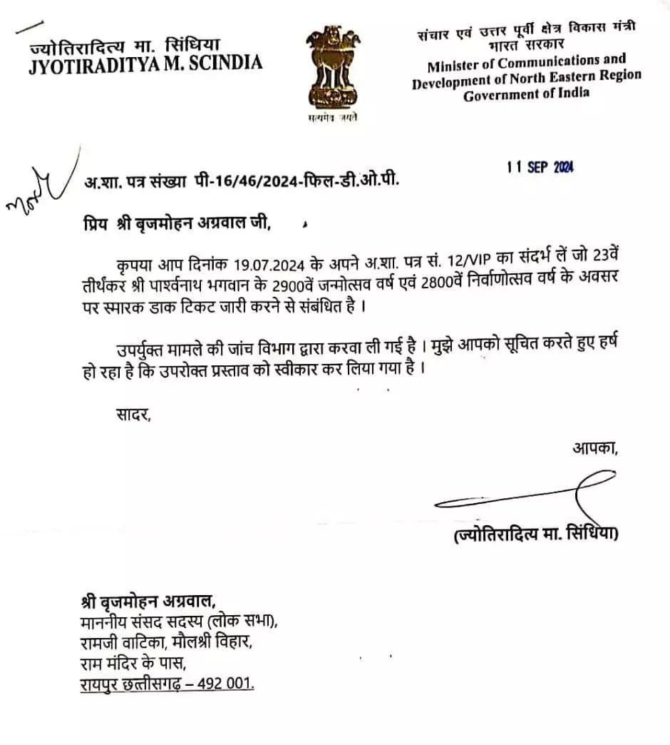 सिंधिया ने इस अनुरोध को सहृदयता से लेते हुए केंद्र सरकार तक पहुंचाया। इसके बाद सरकार ने भगवान पार्श्वनाथ पर डाक टिकट जारी करने का निर्णय लिया। जैन सखी संगठन की अध्यक्ष, समाजसेविका भावना जैन ने कहा कि भगवान पार्श्वनाथ जी का जीवन अहिंसा और करुणा का आदर्श माना जाता है। उन्होंने अहिंसा, सत्य, अस्तेय, अपरिग्रह का मार्ग दिखाया था। उन पर डाक टिकट जारी होना समस्त जैन समाज के लिए हर्ष और गौरव का विषय है। सरकार तक प्रभावी ढंग से हमारी बात पहुंचाने के लिए हम केंद्रीय मंत्री ज्योतिरादित्य सिंधिया का हार्दिक आभार व्यक्त करते हैं।