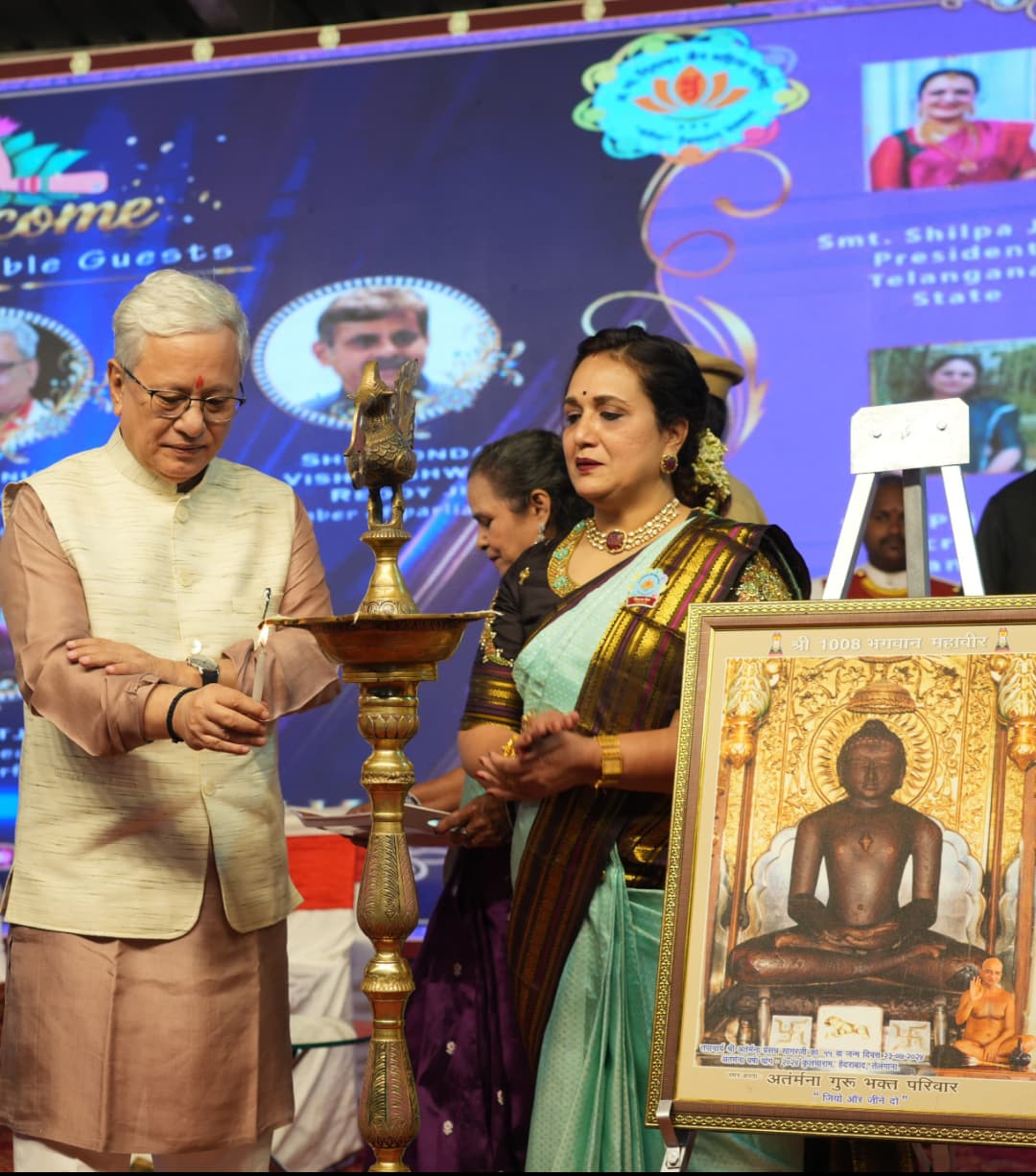 हैदराबाद। अखिल भारतवर्षीय जैन महिला परिषद-तेलंगाना के तत्वावधान में मदीनागुड़ा स्थित माय होम ज्वेल परिसर में सरोवर झंकार कार्यक्रम का भव्य एवं गरिमामय आयोजन 9 नवंबर को किया गया। इस विशेष अवसर पर महिला परिषद प्रांतीय अधिवेशन, अलंकरण समारोह एवं संगीतमय जैन संध्या भी हुई। इसमें राजस्थान के सुप्रसिद्ध गायक अजीत जैन ने भक्तिरस एवं देशभक्ति से ओतप्रोत प्रस्तुतियां दीं। समारोह में मुख्य अतिथि तेलंगाना के राज्यपाल जिष्णु देव वर्मा ने कहा कि जैन समाज के मानवीय मूल्य, संस्कृति, सेवा और प्रेरक नेतृत्व समाज को सकारात्मक दिशा देते हैं। परिषद द्वारा देशभर में हजारों से अधिक सदस्यों को सामाजिक सेवा से जोड़ना अनुकरणीय है। स्वच्छता, पोषण, शिक्षा, पर्यावरण संरक्षण और मानव सहयोग-ये सभी कार्य जैन समाज की पहचान हैं। भगवान महावीर का संदेश सिखाता है कि जहां अहिंसा है, वहां संघर्ष नहीं होता। सत्य, करुणा और एकता-यही जैन समाज के मूल मूल्य हैं।