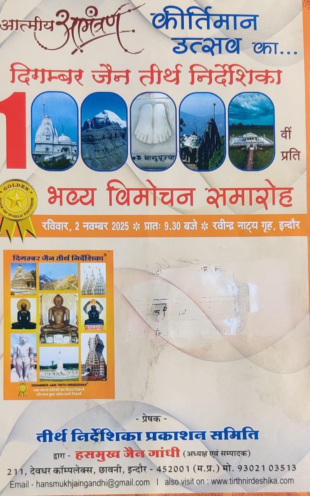 इंदौर। संपूर्ण भारत के प्रांतवार नक्शों सहित दिगंबर जैन तीर्थों की जानकारी और वहां उपलब्ध सुविधाओं का विवरण देने वाली लोकप्रिय जैन तीर्थ निर्देशिका की एक लाखवीं प्रति के प्रकाशन एवं विमोचन का विश्व कीर्तिमान उत्सव रविवार, 2 नवंबर को प्रातः 9:30 बजे रवींद्र नाट्य गृह में आयोजित होगा।