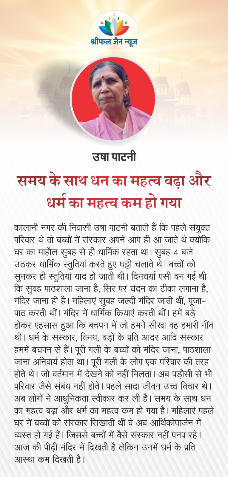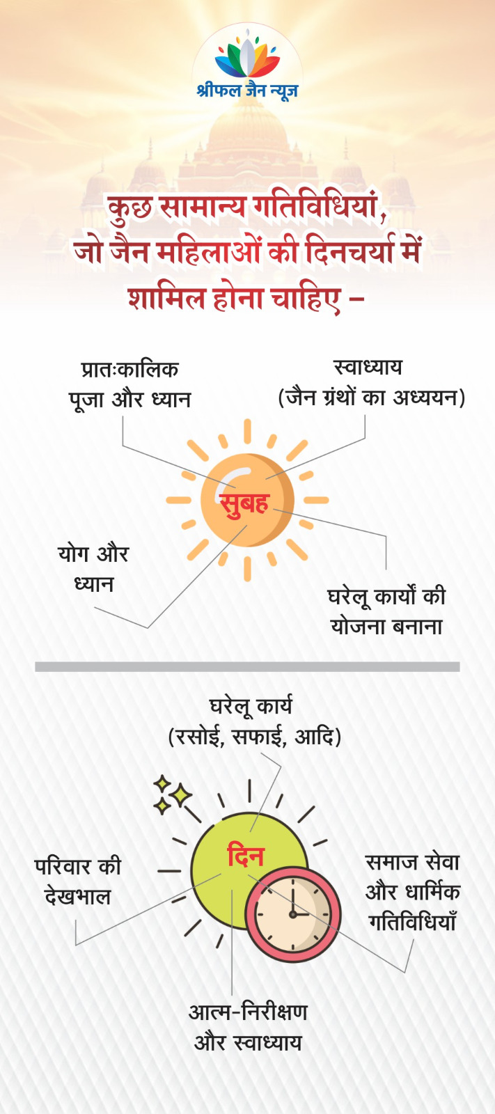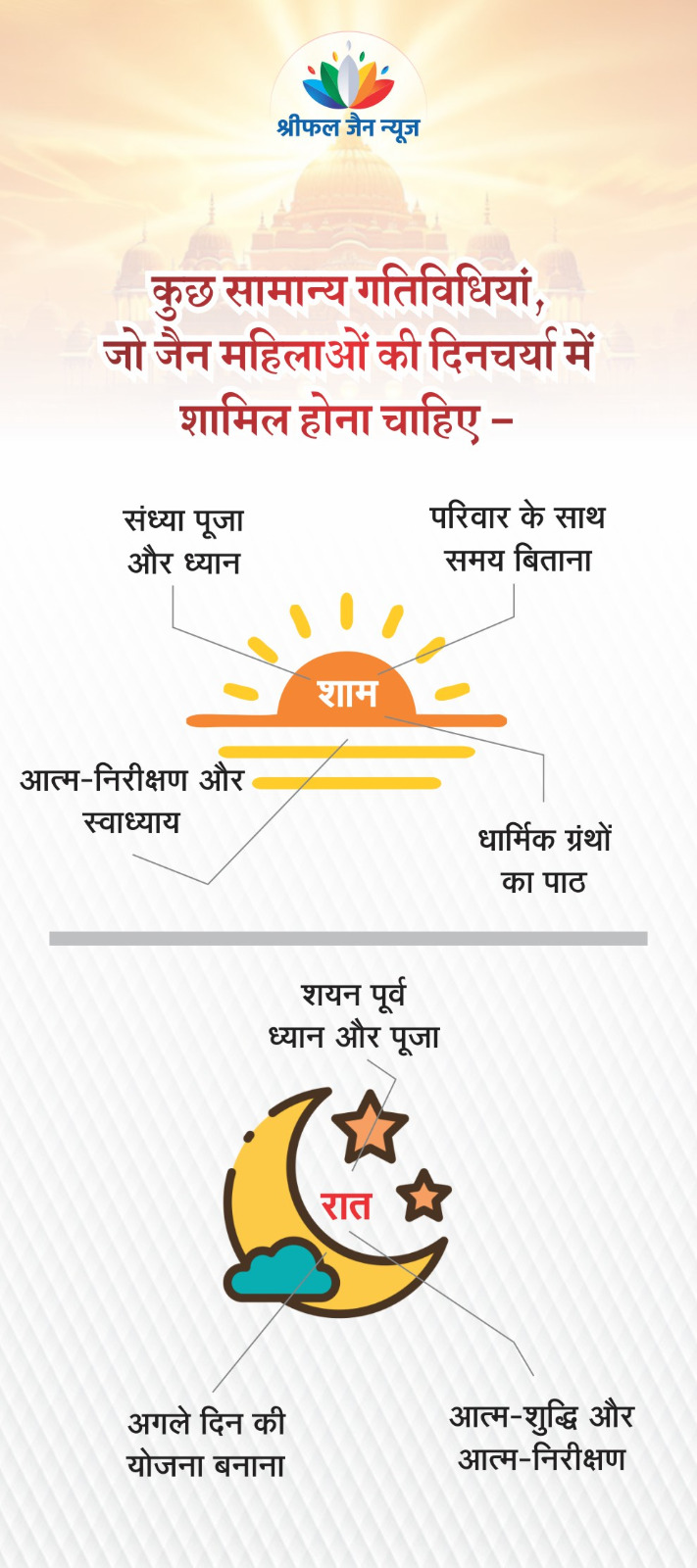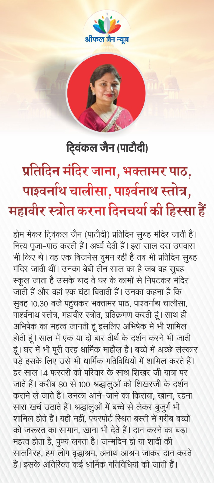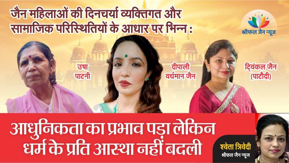 जैन महिलाओं की दिनचर्या उनके धर्म और संस्कृति के अनुसार व्यवस्थित होती है। जिसमें ध्यान, स्वाध्याय और आत्म-शुद्धि पर विशेष ध्यान दिया जाता है। जैन महिलाओं की दिनचर्या व्यक्तिगत और सामाजिक परिस्थितियों के आधार पर भिन्न भी हो सकती है। समय परिवर्तन होने से आधुनिकता का प्रभाव नई पीढ़ी पर चढ़ता नजर आ रहा है लेकिन फिर भी वे धर्म के महत्व को जानते और समझते हैं। कुछ जैन महिलाओं से उनकी दिनचर्या के बारे में बात की गई, ये तथ्य सामने आए। पढ़िए श्रीमती श्वेता त्रिवेदी की एक रिपोर्ट…