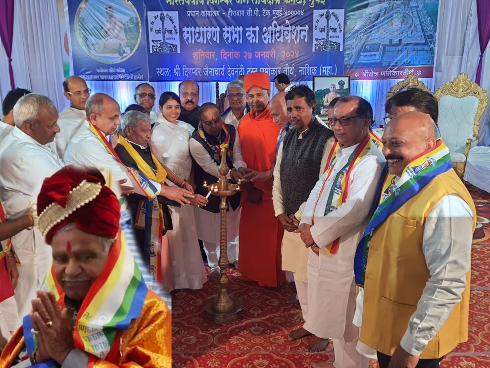देश की सबसे बड़ी दिगम्बर जैन समाज की अग्रणी संस्था ” भारतवर्षीय दिगम्बर जैन तीर्थक्षेत्र कमेटी ” की राष्ट्रीय साधारण सभा णमोकार तीर्थ में हुई। इसमें श्री देवनंदी जी महाराज के सान्निध्य एवं पीठाधीश स्वस्तिश्री रविन्द्रकीर्ति जी स्वामी तथा देश के विख्यात प्रतिष्ठाचार्य बा. ब्र. जयनिशांत टीकमगढ़ की विशेष उपस्थिति थी। इसमें चुनाव अधिकारी ने की राष्ट्रीय अध्यक्ष पद हेतु जम्बू प्रसाद जैन के नाम की घोषणा की और प्रमाण पत्र सौंपा। पढ़िए राजेश रागी और रत्नेश जैन बकस्वाहा की रिपोर्ट।