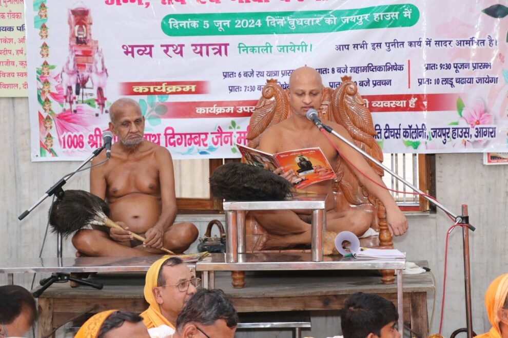 आगरा। मेडिटेशन गुरु उपाध्यायश्री विहसंत सागर जी महाराज ससंघ के मंगल सानिध्य एवं सकल दिगंबर जैन समाज जयपुर हाउस के तत्वावधान में आगरा के जयपुर हाउस स्थित टीचर्स कॉलोनी के श्री शांतिनाथ दिगंबर जैन मंदिर के 30वें स्थापना वर्ष के उपलक्ष्य में जैन धर्म के 16वें तीर्थंकर श्री शांतिनाथ भगवान के जन्म-तप-मोक्ष कल्याणक के पावन अवसर पर भव्य रथयात्रा एवं महामस्तकाभिषेक महोत्सव का आयोजन धूमधाम के साथ किया गया। जिसमें भक्तों ने जयपुर हाउस जैन मंदिर से प्रभु शांतिनाथ की प्रतिमा को रथ में विराजमान कर बैंड बाजों के साथ भव्य शोभा यात्रा निकाली गई।
