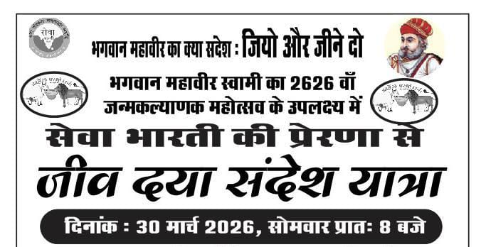 भगवान महावीर स्वामी जी के 2626वें जन्म कल्याणक महोत्सव के उपलक्ष्य में सेवा भारती की प्रेरणा से जीवदया संदेश यात्रा का आयोजन किया जा रहा है। इस यात्रा का उद्देश्य भगवान महावीर द्वारा दिए गए जीवदया, करुणा, सत्य, अहिंसा एवं “जियो और जीने दो” के सिद्धांतों को जन-जन तक पहुंचाना है। पढ़िए सोनल जैन की रिपोर्ट…