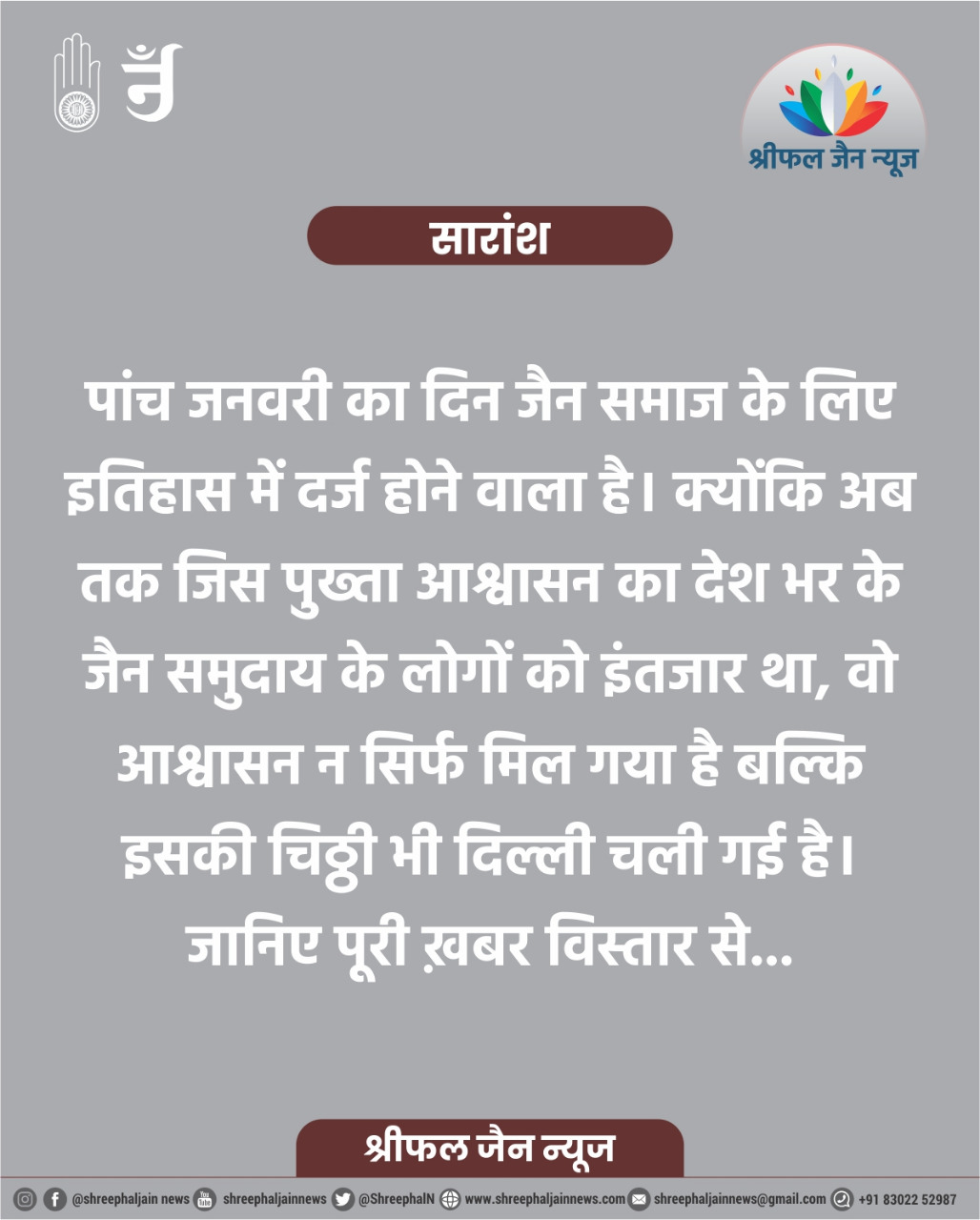 जैन समाज एक अर्से से इस बारे में आंदोलन कर रहा था । मुबंई,कोल्हापुर,जयपुर,रांची,इंदौर देश का ऐसा कोई कोना नहीं था, जहां जैन समाज ने सड़कों पर अपनी ताकत नहीं दिखाई हो । हमारे साधु-संतों का तो क्या ही कहना, इतने संयमित और संतुलित आंदोलन को पग-पग पर दिशा देने वाले दिगम्बर,श्वेताबंर जैन साधुओं की कीर्ति की कहानी घर-घर में सुनाई जाएगी ।