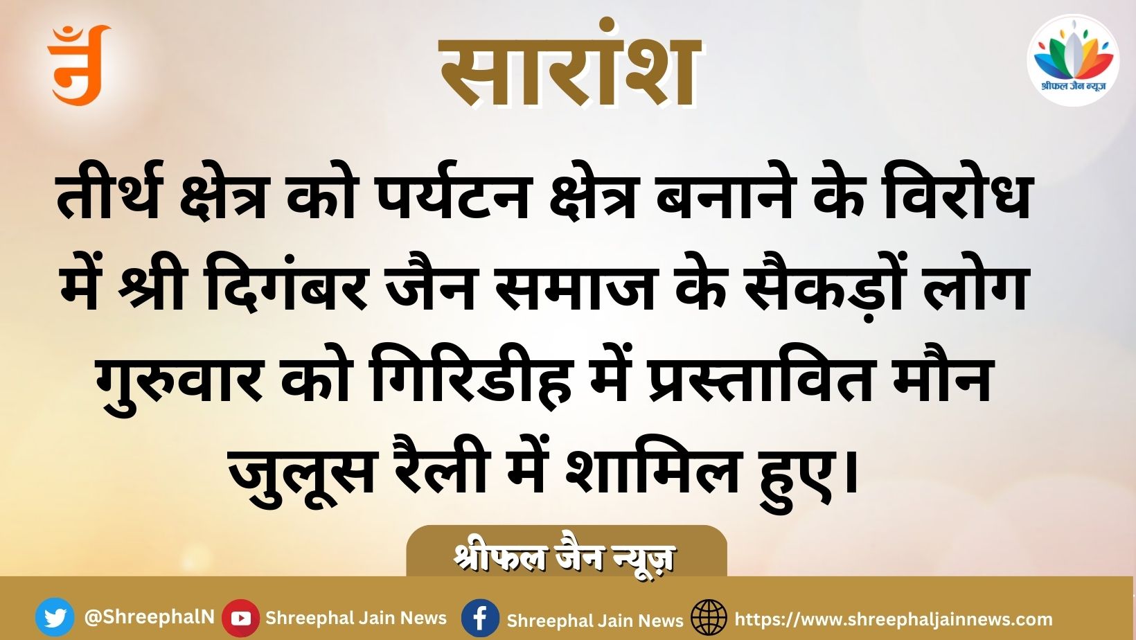 हम सभी झारखंड भारतवर्ष के जैन समाज के लोग निवेदन करते हैं कि जैन धर्म का सर्वोच्च तीर्थ सम्मेद शिखर पारसनाथ को जैन धर्म के अनुरूप ही पवित्र तीर्थ क्षेत्र घोषित किया जाए जिससे धर्म क्षेत्र की मर्यादा और गरिमा विद्यमान रह सके।