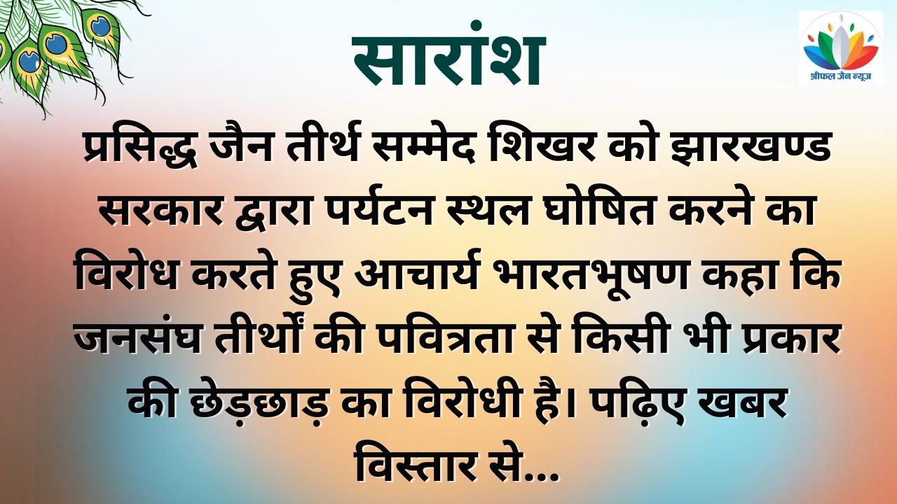आचार्य भारतभूषण ने कहा कि पूरे देश में जैन मतानुयायी इसके विरोध में प्रबल आन्दोलन कर रहे हैं किंतु हेमन्त सोरेन की सरकार ने अभी तक अपना निर्णय वापस नहीं लिया। जनसंघ अध्यक्ष ने कहा कि हिन्दू जैन पवित्र स्थलों को पूरे देश में पर्यटन स्थल घोषित कर वहाँ मद्य-मांस व अश्लील मनोरंजन का केन्द्र बनाया जा रहा है जो बेहद दुर्भाग्यपूर्ण है।