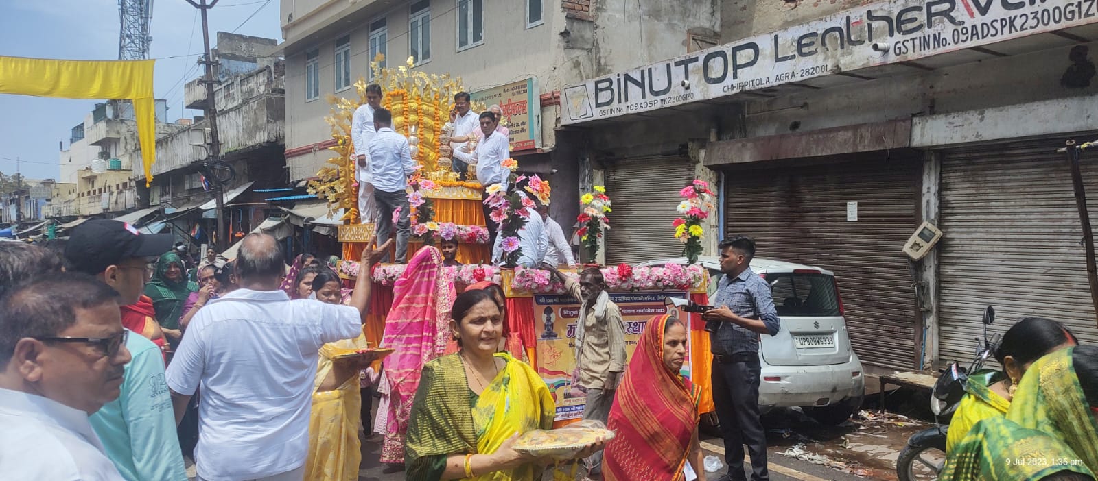 आगरा। यहां श्री पार्श्वनाथ दिगम्बर जैन मन्दिर, जैन भवन, छिपीटोला में आज भव्य शोभायात्रा का शुभारंभ हुआ। इसमें सबसे पहले महिलाएं कलश लेकर चल रही थी। झांकी में कलश लेकर बैंड अपनी मधुर ध्वनि से तुम से लगी लगन भजन पर नृत्य व संगीत पर महिलाएं झूम रही थी। मुनि श्री 108 योग्य सागर महाराज, मुनि श्री 108 साक्ष्य सागर महाराज, मुनि श्री 108 निवृत सागर महाराज के सानिध्य में 2023 का मंगल कलश स्थापना समारोह निर्मल सेवा सदन छिपीटोला आगरा में धूमधाम से आयोजित किया गया।