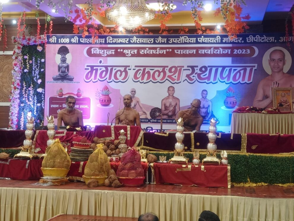 चातुर्मास कलश स्थापना समारोह में पहला कलश लेने का सौभाग्य प्रवीन जैन पद्मावती , दूसरा कलश भुवनेश जी रजत, तीसरा कलश रविंद्र मनोज लेहारा, चौथा कलश मुकेश, राजीव, राहुल, सुभाष चंद्र राकेश कुमार जैन, पांचवां कलश संजय कुमार, अजय कुमार जैन को मिला। ध्वजारोहण वीरेंद्र शास्त्री परिवार को मिला। विधानाचार्य शुभम भैया के निर्देशन में कलश स्थापित किए गए। भजनों की प्रस्तुति पर श्रद्धालुओं ने नृत्यमय भक्ति की। श्रुत संवधन पावन वर्षायोग स्थापना हुई। मंच संचालन सतेंद्र जैन ने किया। इस प्रकार चातुर्मास मंगल कलश स्थापना का यह पावन समारोह विशाल जनसमुदाय के मध्य सानन्द और हर्षोल्लास के साथ संपन्न हुआ। इस मौके पर मंदिर कमेटी (कार्यवाहक अध्यक्ष एकांत) अनिल जैन कांटा, प्रवेश जैन (मंत्री), रविंद्र जैन (कोषाध्यक्ष), प्रदीप जैन सीए मुख्य सयोजक, राजेश जैन सयोजक, चक्रेश जैन संयोजक, रोहित जैन संयोजक, विवेक जैन संयोजक, प्रवीन जैन (नेताजी), दीपक जैन, आशु जैन (बाबा), राहुल जैन, निखिल जैन ,मोनू नितिन जैन, विराग चैन ,सौरभ जैन राहुल जैन (वासु), मुरारी लाल जैन, सतेन्द्र जैन, मनोज जैन, अखलेश, पवन, राजीव, आदिश, प्रभारी राहुल जैन आदि थे। मीडिया प्रभारी राहुल जैन ने बताया कि 10 जुलाई 2023 को सुबह 8:30 बजे आगरा के इतिहास में पहली बार सिद्ध पुरुष श्री राम कथा पदम पुराण जैन रामायण वाचना का कार्यक्रम निर्मल सेवा सदन में होगा
