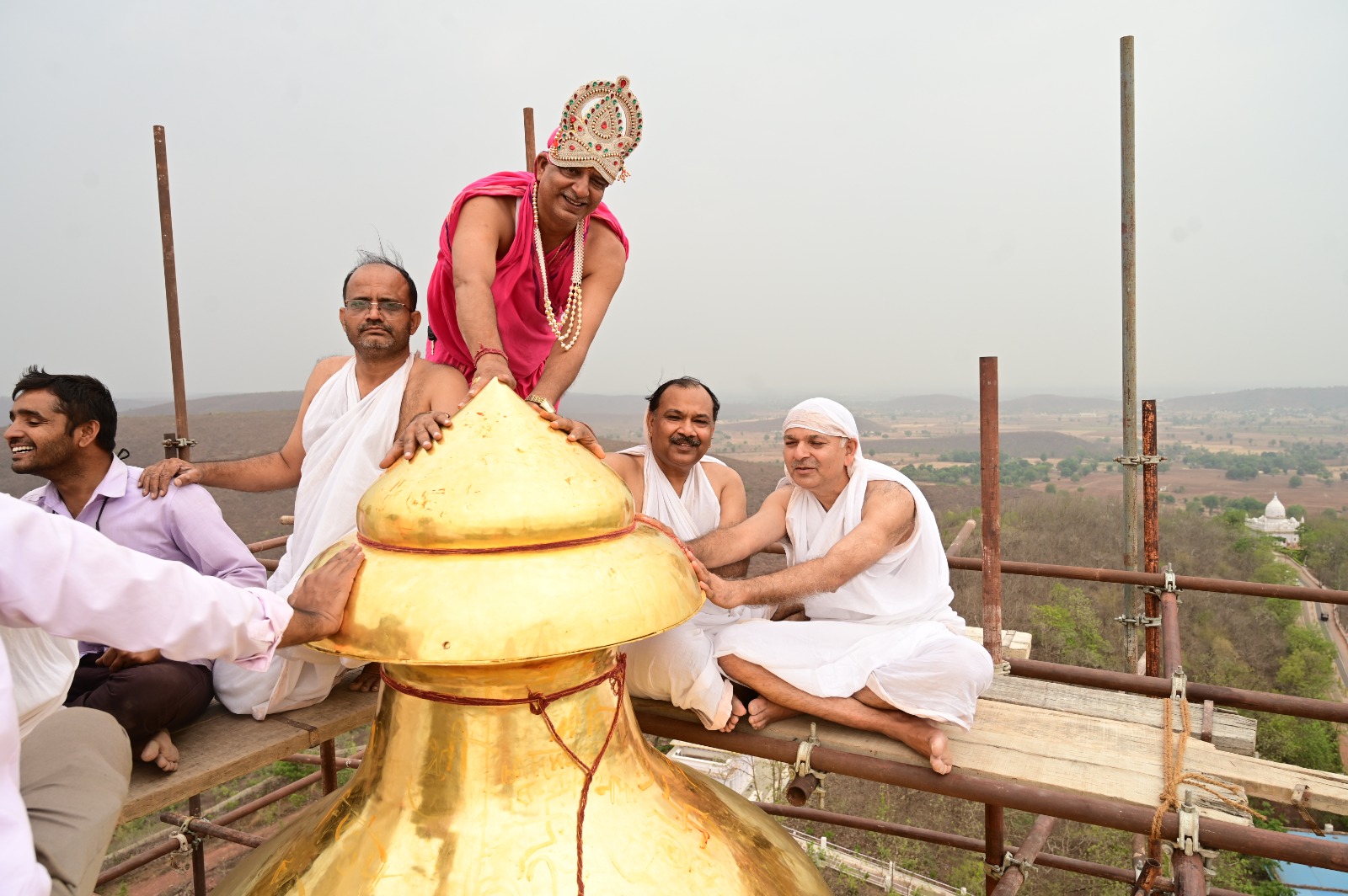 कुंडलपुर (दमोह)। सुप्रसिद्ध सिद्ध क्षेत्र, जैन तीर्थ कुंडलपुर में जिन सूर्य संत शिरोमणि युग श्रेष्ठ आचार्य भगवन श्री विद्यासागर जी महाराज के परम प्रभावक शिष्य विद्या शिरोमणि आचार्य श्री समय सागर जी महाराज के चतुर्विध संघ के मंगल सानिध्य में आयोजित बड़े बाबा जिनालय कलशारोहण एवं सहस्त्रकूट जिनालय जिनबिम्ब वेदी प्रतिष्ठा महा महोत्सव के अवसर पर 11 जून को प्रातः अभिषेक, शांति धारा नित्यमह पूजन हुई। पूज्य बड़े बाबा जिनालय एवं दाएं-बाएं के जिनालय पर कलशारोहण की क्रिया प्रारंभ हुई। स्वर्ण कलश के ऊपरी भाग पर आचार्य श्री समय सागर जी महाराज एवं मुनि संघ के साधुओं ने चंदन से स्वास्तिक बनाया। फिर तो लोगों में स्वास्तिक बनाने की होड़ मच गई। कलश के ऊपरी भाग को एवं कलशारोहण कर्ताओं को क्रेन के द्वारा ऊपर मंदिर के शिखर पर पहुंचाया गया। प्रतिष्ठाचार्य सम्राट ब्रह्मचारी विनय भैया ने कलशारोहण की क्रियाएं संपन्न कराई।