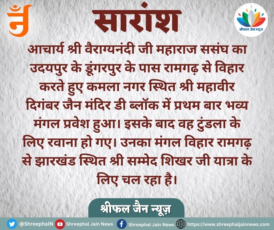 आगरा. शुभम जैन । आचार्य श्री वैराग्यनंदी जी महाराज ससंघ का उदयपुर के डूंगरपुर के पास रामगढ़ से विहार करते हुए कमला नगर स्थित श्री महावीर दिगंबर जैन मंदिर डी ब्लॉक में प्रथम बार भव्य मंगल प्रवेश हुआ। य़हां श्रद्धालुओं ने आचार्य संघ की आगवानी कर पाद प्रक्षालन किया। मंगल प्रवेश के पश्चात आचार्य संघ ने सर्वप्रथम मंदिर में विराजमान मूलनायक भगवान महावीर स्वामी के प्रतिमा के दर्शन किए।
