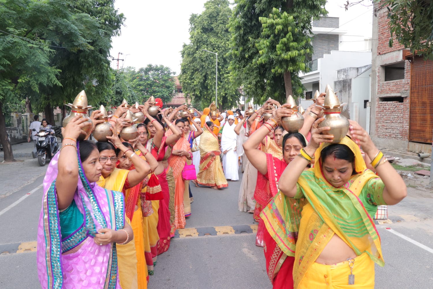 आगरा । श्री महावीर दिगंबर जैन मंदिर, डी ब्लॉक, कमला नगर में आर्यिका श्री अर्हम श्री माताजी ससंघ के मंगल सानिध्य में चार दिवसीय रोग शोक निवारण भक्तामर स्तोत्र अनुष्ठान का शुभारंभ हुआ। उद्घाटन प्रथम दिन सौभाग्यशाली महिलाओं ने घटयात्रा निकालकर किया। घटयात्रा के बाद ध्वजा रोहण पीएनसी इंफ्राटेक के सीएमडी प्रदीप जैन एवं मीना जैन के द्वारा किया गया। इसके बाद भक्तों ने श्रीजी का अभिषेक एव शांतिधारा की। इस घटयात्रा में 50 महिलाएं कलश लेकर चलीं। इस कार्यक्रम में संगीत शशि पाटनी एंड पार्टी आगरा के कलाकारों ने दिया।