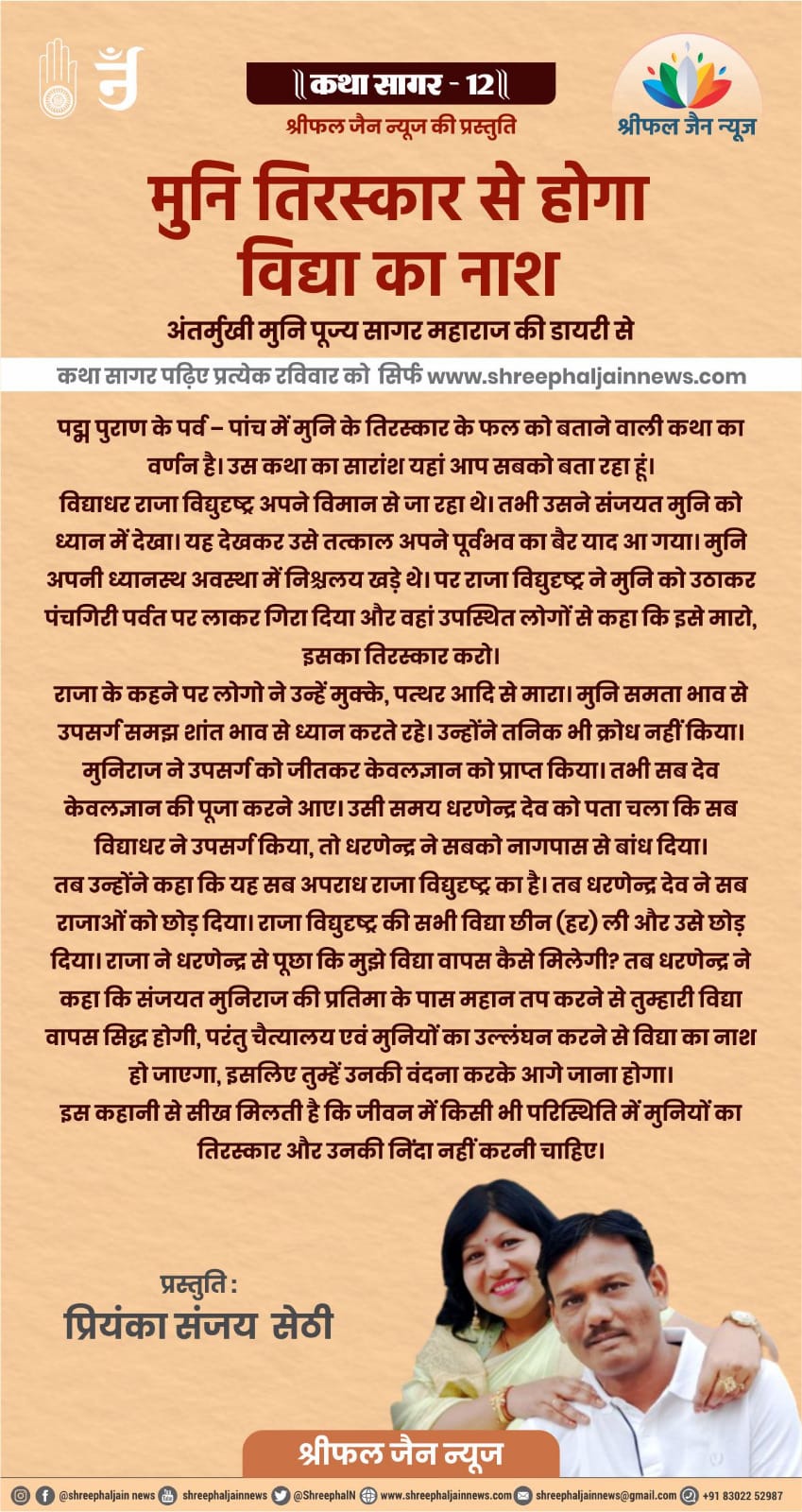 इस कहानी से सीख मिलती है कि जीवन में किसी भी परिस्थिति में मुनियों का तिरस्कार और उनकी निंदा नहीं करनी चाहिए।